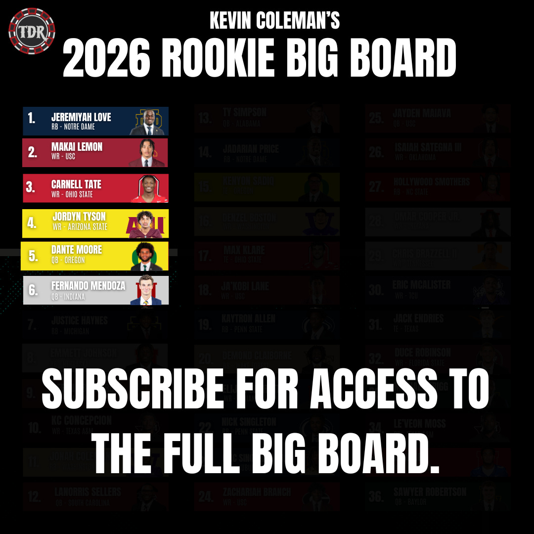 This Big Board isn’t just another ranking dump, it’s a roadmap. Whether you’re trying to spot the real tier breaks, prep for offseason trades, or stay ahead of the rookie-draft market, this board gives you a data-backed pulse on the class as it stands heading into the postseason. I’ll walk through updated rankings, dig into the biggest risers and fallers, and break down how on-field performance, traits, and projected draft capital are shifting long-term value.