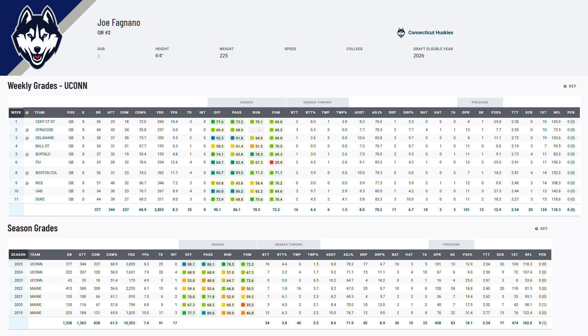 At 6’4”, 225 pounds, Fagnano possesses an NFL frame, strong processing ability, and impressive accuracy, he can layer throws, make anticipatory reads, and protect the football better than almost anyone in the country. The only knock? His age. But if Tyler Shough and other late bloomers have earned NFL opportunities, Fagnano deserves to be in that conversation.