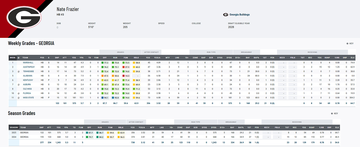 After an up-and-down start to the season filled with fumble concerns, Nate Frazier responded with his best performance yet, 12 carries for a career-high 181 yards and a touchdown in Georgia’s 41–21 win over Mississippi State. He looked explosive, confident, and in complete command of his reads. His 59-yard touchdown run showcased his elite burst and long speed, while multiple chunk plays proved his improved vision and patience behind a dominant Georgia offensive line.