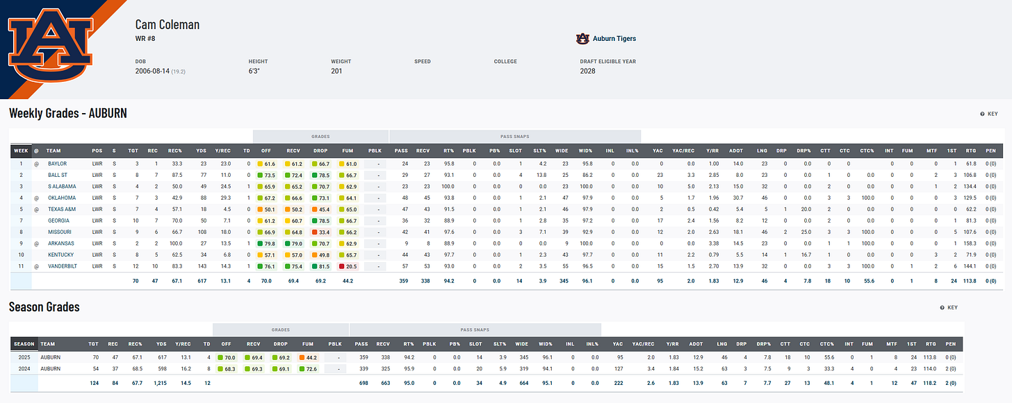 Bottom line: Cam Coleman’s talent has never been in question and now his production is catching up. If Auburn can keep him out of the transfer portal (or if he lands in a better spot), he’ll reassert himself as one of the premier devy wideouts in the nation.