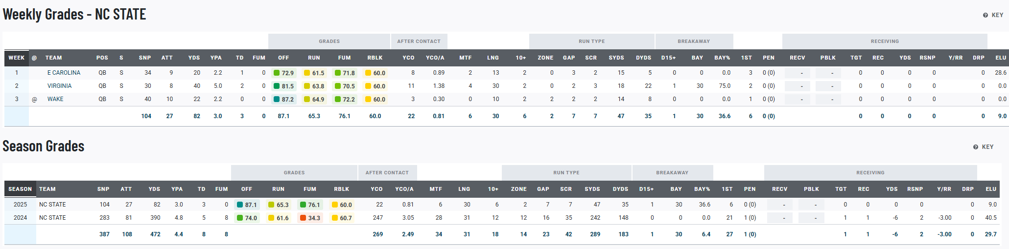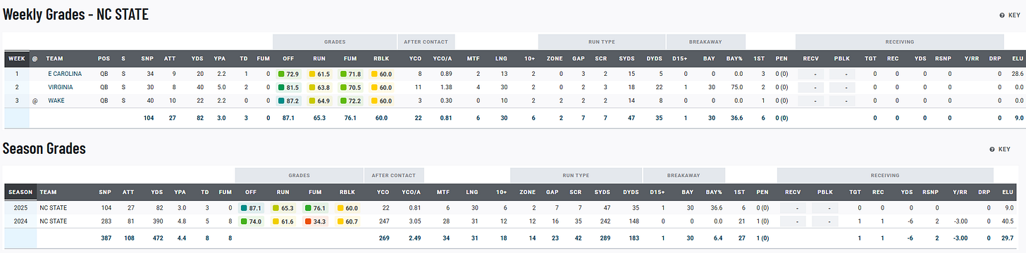 He’s operating in a well-designed system under Kurt Roper that plays to his strengths, quick reads, balanced tempo, and designed runs, and he’s executing at a high level. There’s still some concern with how many hits he’s taking, especially on QB draws, but the trajectory here is undeniable.