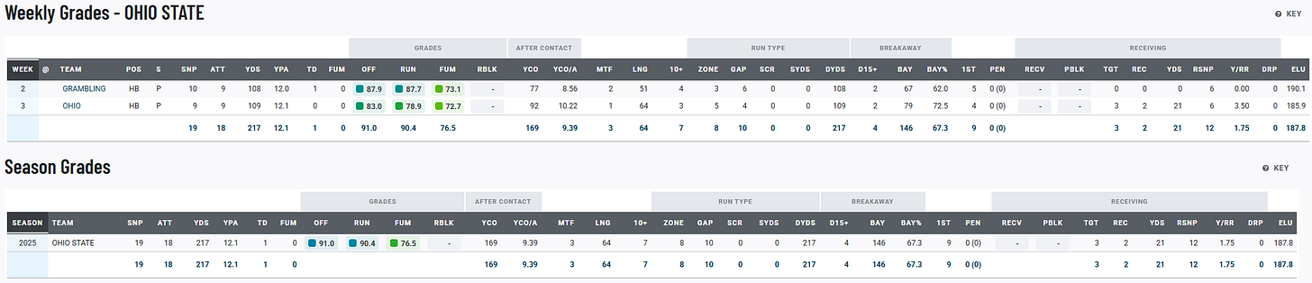 Ohio State’s passing game is elite, but it needs a run threat to keep defenses honest. Jackson is that threat. He's not a complete back yet, he needs polish in pass pro and ball security, but he's trending in that direction fast. With the bye week coming before Big Ten play begins against Washington, don’t be surprised if Jackson’s role expands even further. Whether he’s listed as the starter or not, he's going to see starter-level touches moving forward.