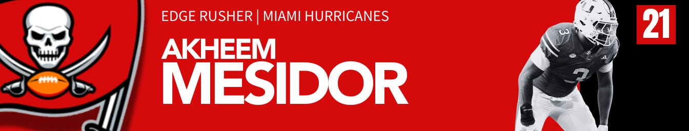 After trading down, the Bucs select the player most believe they’ll take at 15. Mesidor is old, but the Bucs should be in go-mode in an attempt to get back to division titles and potential Super Bowl runs. Outside of his age, it’s hard to pick nits with his skill set.