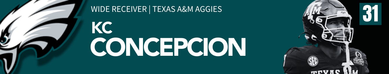 The A.J. Brown saga ends with a trade to the Patriots to give Drake Maye a real No. 1 wideout. The Eagles replace him with KC Concepcion, an incredibly talented wideout, when he catches the football consistently. If he works on his hands, he has the potential to be the best wideout in this class. Howie strikes again.