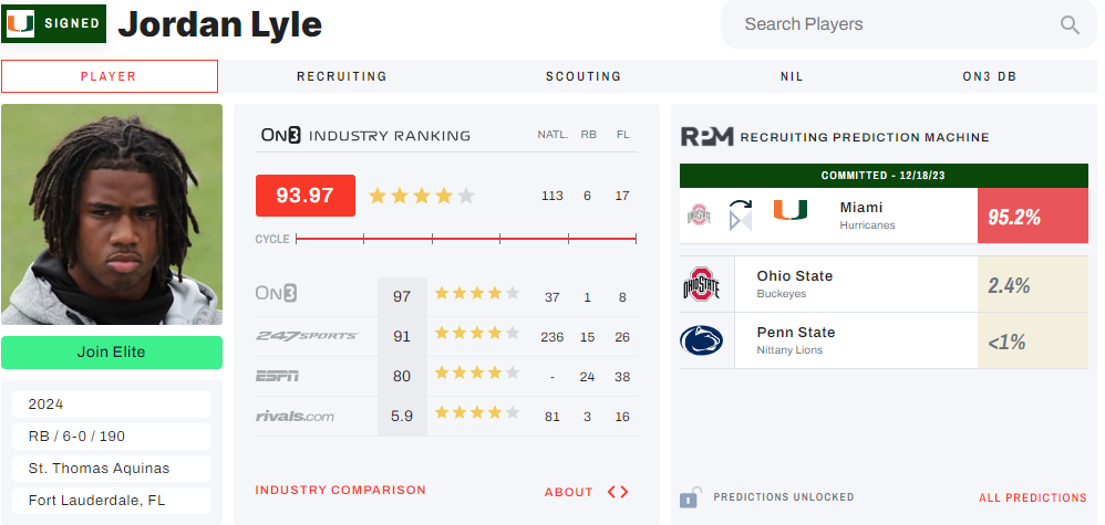 Lyle was a four-star in the composites who attended St. Thomas Aquinas in Florida. As a Junior in 2022, Lyle rushed for 1,015 yards on 91 carries with 12 touchdowns. Lyle built on that season and showcased himself as a Senior with 1,376 yards on 130 carries and 21 touchdowns and added 13 receptions for 177 yards and one touchdown. Lyle held 28 offers and initially made his commitment to Ohio State before the summer of 2023 and appeared to be locked in with the Buckeyes, but a late chaotic event led to commitment flips that included Miami losing Kevin Riley at the same position to Alabama, forced Miami to a full court press to try and keep Lyle home and they were able to flip Lyle late in the process as he announced his decision to flip from Ohio State to the University of Miami.