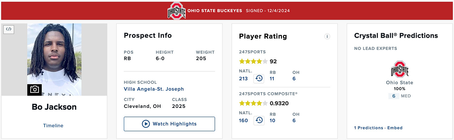 Jackson has an impressive frame for the next level and is already on campus at Ohio State, having bulked up to 210 lbs for spring camp. He is an exciting runner who thrives between the tackles and possesses good speed to reach the edge. His vision and patience behind the line are solid, but his greatest strength is his contact balance—consistently breaking through the first line of defense and using his lateral quickness to evade defenders at the second level.