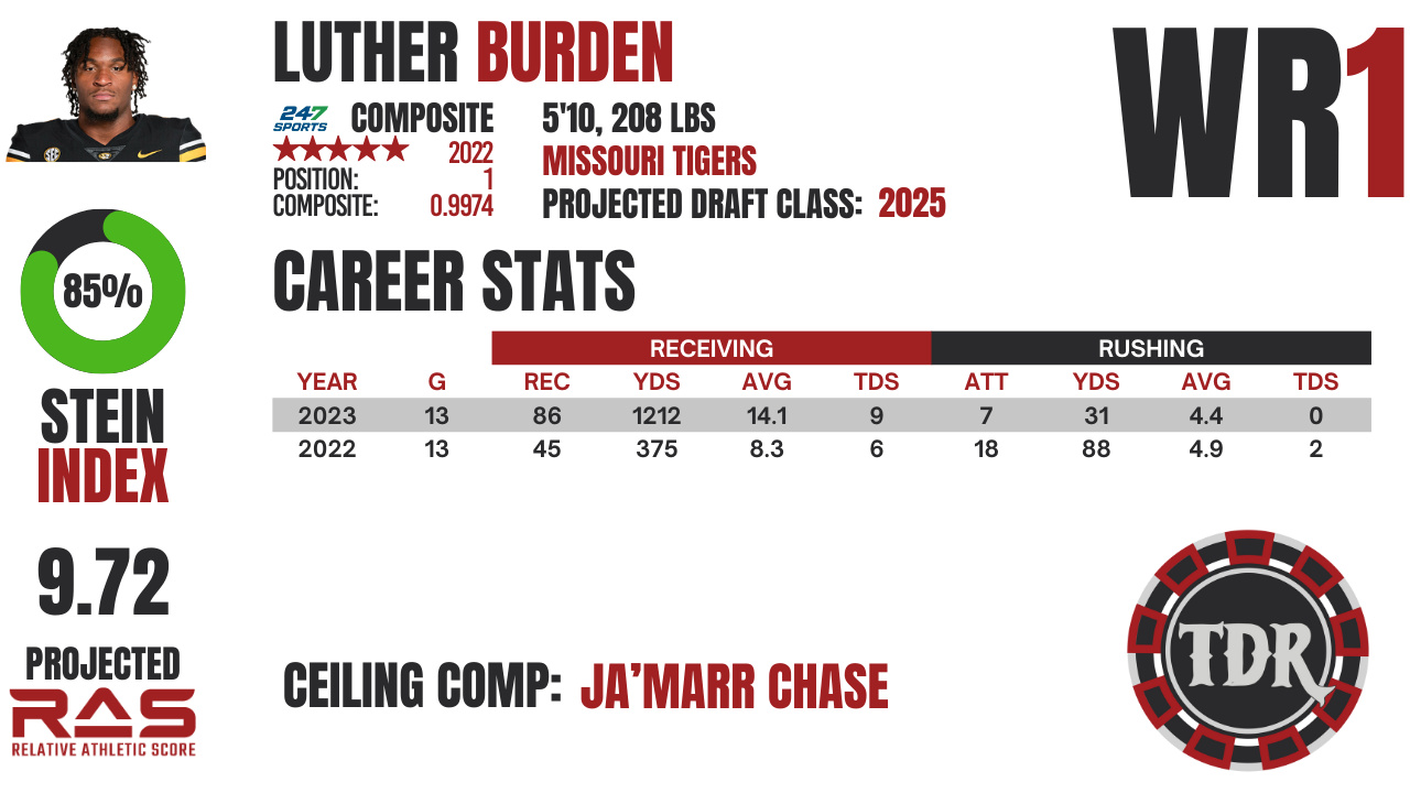 Andy Pham gives a detailed look at Missouri WR Luther Burden III heading into the 2024 season. Can Burden finish as WR1 in the class?