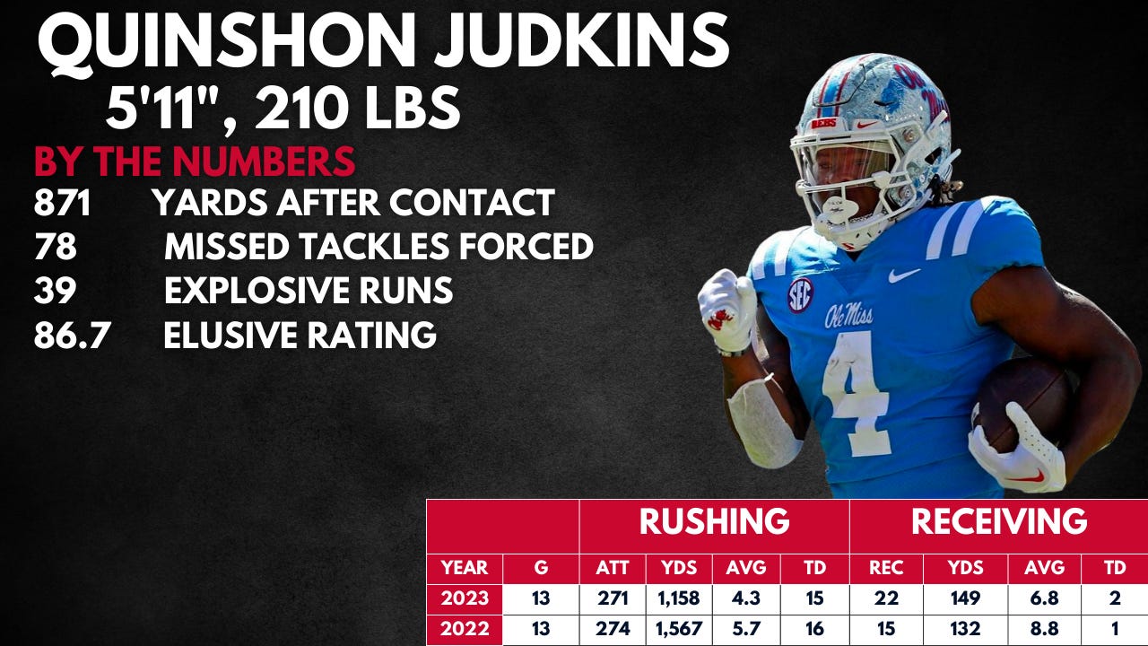 Judkins was a 3* in the composites and attended Pike Road High in Alabama. Judkins was a productive performer for three years and rushed for over 1,100 in each of his final three seasons, which was capped off by a 1,500-yard rushing Senior season with 26 touchdowns. Judkins was part of the 2022 class and initially committed to Ole Miss, where he was expected to be a rotational depth piece behind Zach Evans. Judkins would overtake Evans for the starting position in week eight and never relinquished it. Judkins would rush for over 1,500 yards as a true freshman with 15 touchdowns. Judkins got off to a slow start this past season and was hampered by a nagging injury. Judkins finally found his rhythm in week eight and would finish the season with 100 rushing yards in 5 of the final seven games, with 9 of his 15 rushing touchdowns coming in that span. Once the season ended and the transfer portal opened up, Ole Miss would grab guys left and right to try and build a championship team, and by doing so, Judkins would seek additional NIL money. When Ole Miss balked at potentially giving Judkins additional money, he would enter the portal and end up at Ohio State. Judkins will now be paired with TreVeyon Henderson for the upcoming 2024 season, and the Buckeyes brought in Chip Kelly to be the Offensive Coordinator. Kelly tends to run more than Ryan Day, and we should see an uptick in rushing production for Judkins and Henderson. Additionally, Ohio State should be ahead in most of their games, and Chip Kelly loves to utilize the run game and tire out opposing defenses.