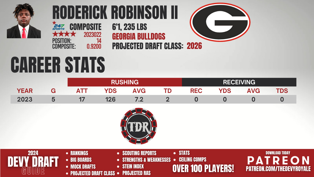 Robinson was a four-star in the composites and attended Lincoln High in San Diego, California. Robinson was a consensus top-15 Running Back in the class. Robinson was a two-year sensation at Lincoln. As a Junior, Robinson rushed for 1,273 yards on 185 carries with 17 touchdowns. For his final season, he topped that by rushing for 2,378 yards on 217 carries with 37 touchdowns. Robinson would finish his High School career with 19 receptions for 176 yards and two additional touchdowns. He rounded out his profile with 12 receptions as a Senior and showcased soft hands for his size. Robinson was also a sure-handed runner, with only one fumble during that span. Robinson held 26 offers and initially committed to UCLA in the Spring of 2022. Georgia made a late offer before that commitment and would stay after Robinson, got him to flip late in the process, and ended up in Athens.
