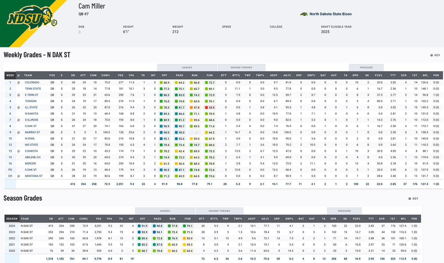 Miller’s legacy at NDSU is cemented with two national championships and 45 career wins, placing him fourth in FCS history. His 2024 season was a masterpiece, with over 3,200 passing yards, 33 touchdowns, and just four interceptions. Add in 631 rushing yards and 12 touchdowns, and you have one of the most complete seasons from an FCS quarterback. Miller’s career stats include a 69.3% completion rate and over 12,000 total yards, highlighting his ability to dominate both through the air and on the ground.