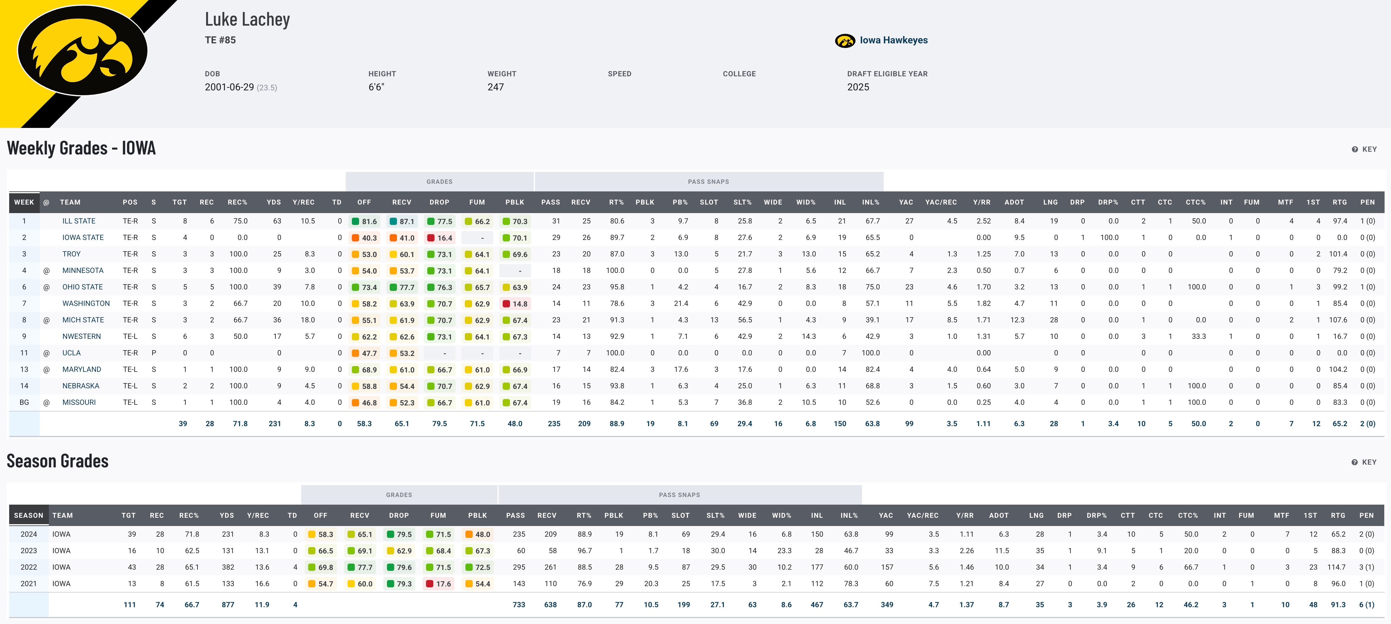 Iowa’s reputation as "Tight End U" sets high expectations, but injuries and inconsistency have hampered Lachey’s career. After showing promise in 2022 (28 catches for 398 yards and four touchdowns), he’s struggled to maintain momentum, logging just 27 catches for 227 yards in 2024. While the physical tools and lineage from Iowa’s elite tight-end pipeline are there, his recent production raises questions. Lachey will need a strong pre-draft process to regain his footing as a potential NFL contributor.