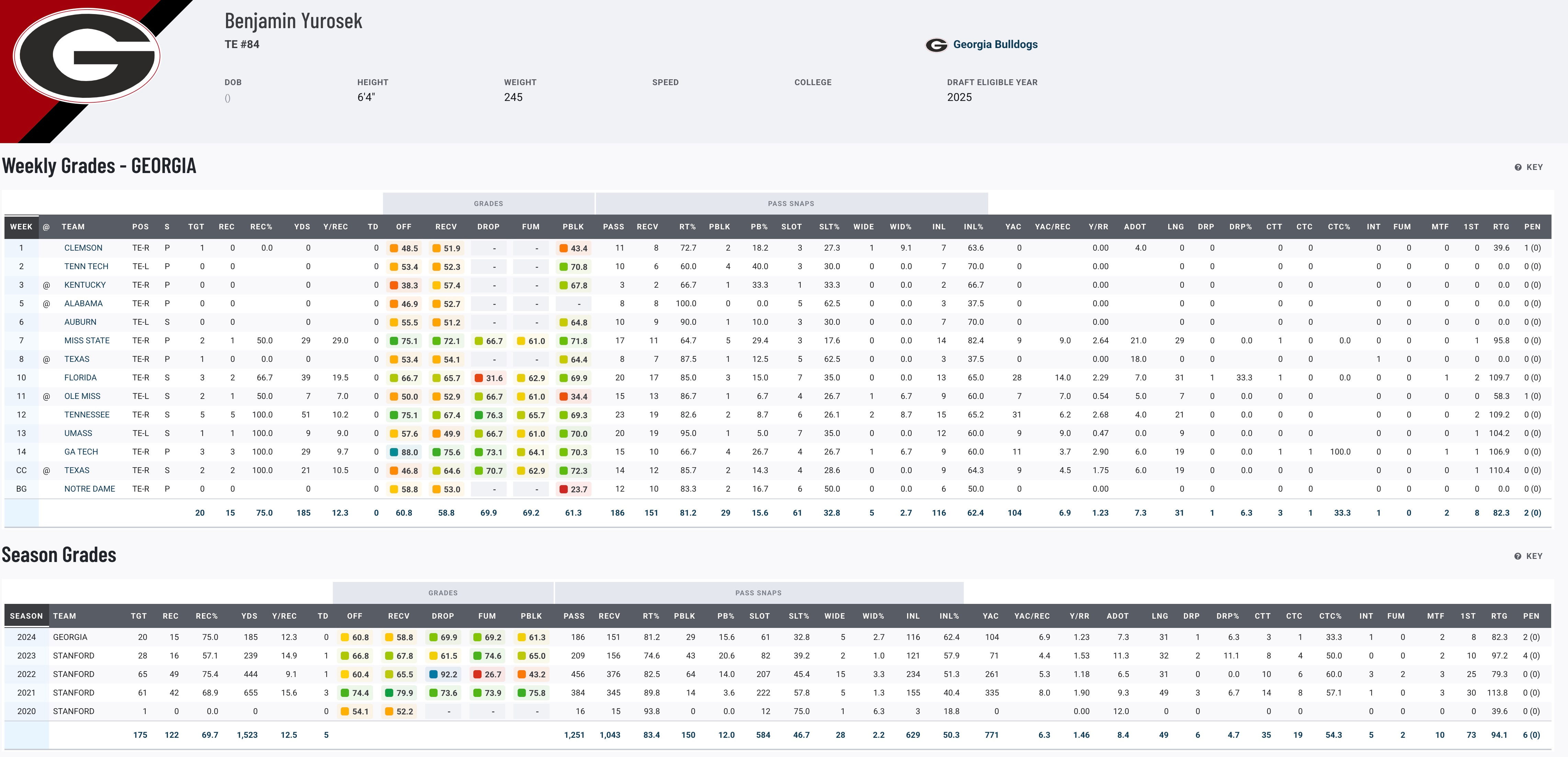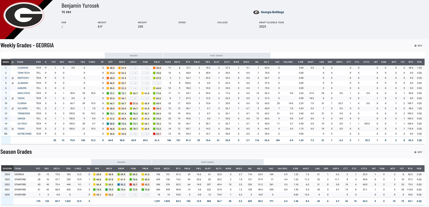 Yurosek began his career at Stanford with a breakout 2021 campaign (653 yards, three touchdowns) but struggled to maintain that level of production, even after transferring to Georgia in 2024. His one season with the Bulldogs was disappointing (15 catches, 185 yards), as he found himself in a rotational role. Despite his limited impact, Yurosek’s combination of size and early-career promise makes him an intriguing prospect for NFL teams willing to bet on his untapped potential. For fantasy purposes, he’s more of a wait-and-see player who will need the right situation to thrive.