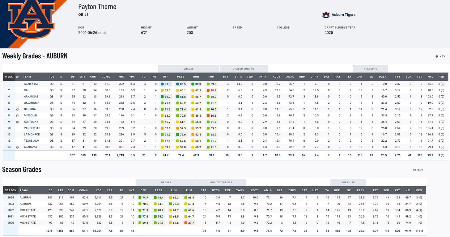 Thorne brought veteran leadership to Auburn after transferring from Michigan State, where he was a two-time team captain. He threw for 2,713 yards, 21 touchdowns, and nine interceptions in 2024 while contributing on the ground with 425 rushing yards. Over his collegiate career, Thorne totaled nearly 9,300 passing yards and 49 touchdowns, adding mobility to his arsenal with several rushing scores.