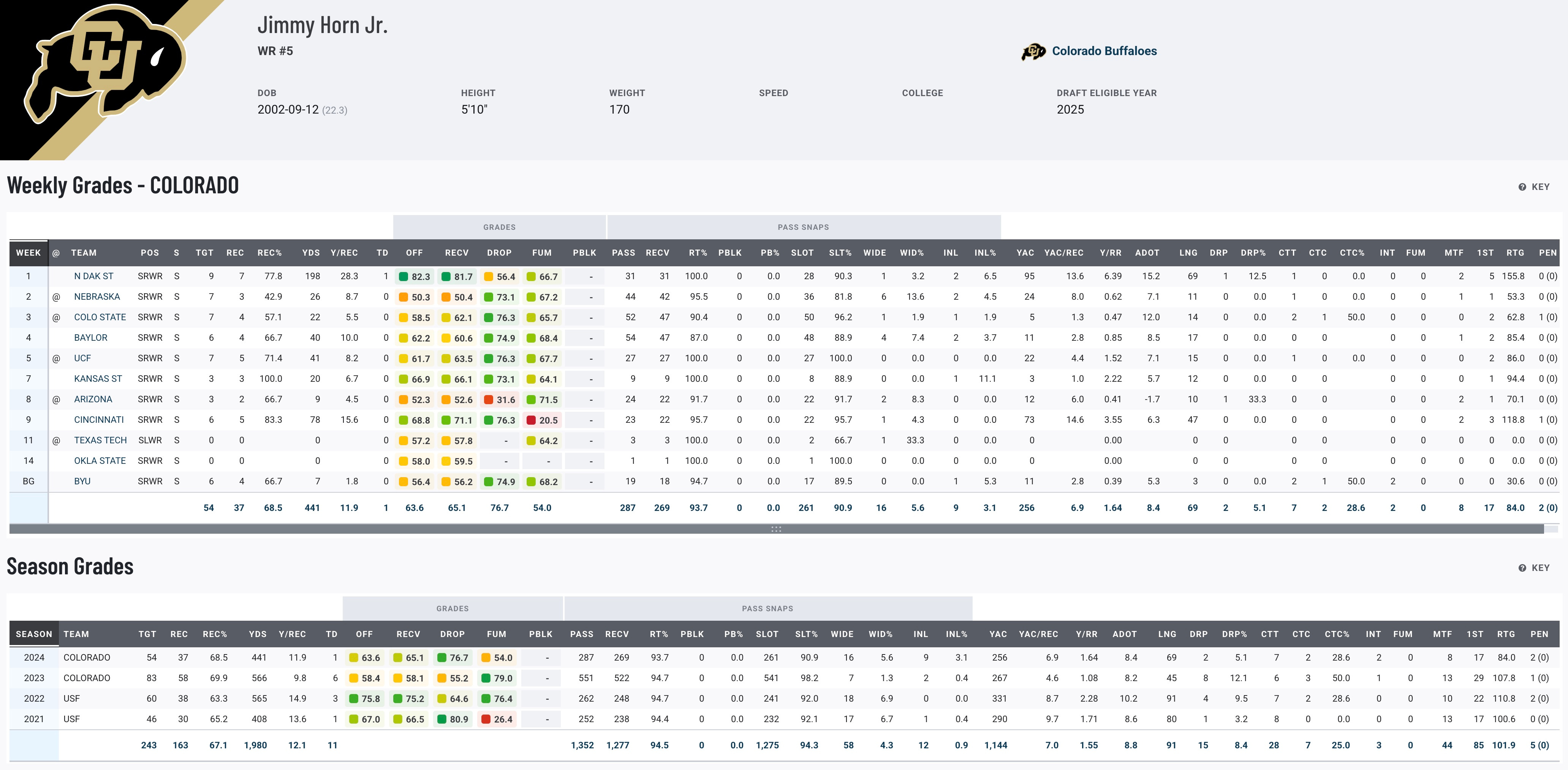 Jimmy Horn Jr. brings elite speed and return game potential to the table. A former standout at USF before transferring to Colorado, Horn has flashed as a vertical threat and in open-field situations. Despite his athleticism, Horn’s skill set leans one-dimensional, with room to grow in terms of physicality and route refinement. His best fit at the next level is as a return specialist and gadget player in a spread offense that maximizes his speed. With 441 yards and a touchdown in 2024, along with solid kick and punt return numbers, Horn offers immediate special teams value while teams groom his receiving ability.