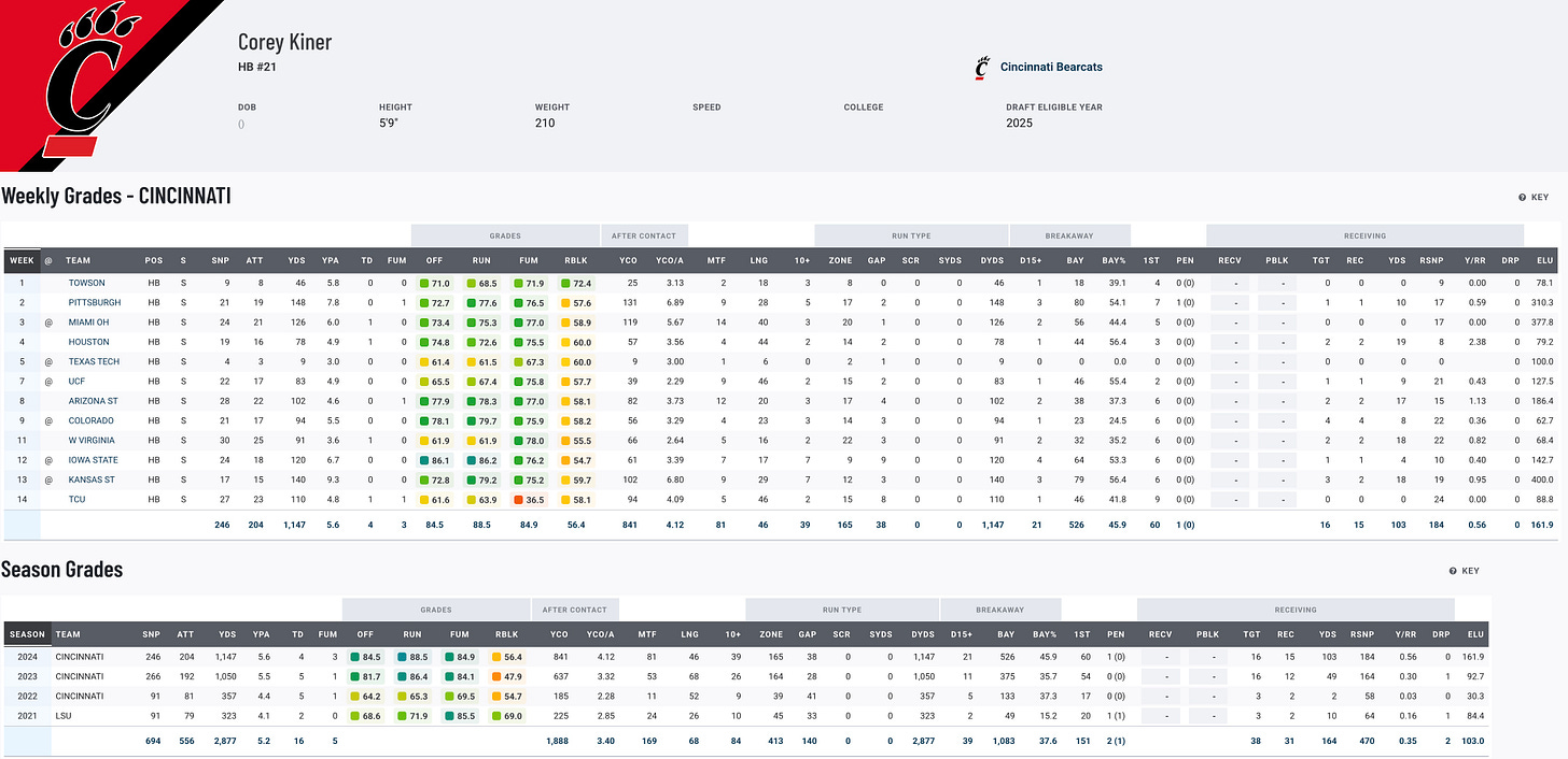 Corey Kiner capped his senior year with 1,153 rushing yards, showcasing his consistency as a dependable contributor for Cincinnati. With over 2,500 career rushing yards and a history of leading RB rooms, Kiner brings experience and leadership to the table. A former Mr. Ohio Football, Kiner’s high school dominance laid the groundwork for his collegiate success. His footwork, balance, and speed make him a change-of-pace back who can provide valuable snaps in a committee. While he may not project as a workhorse, his versatility and skill set should earn him opportunities in rotational backfields at the next level.