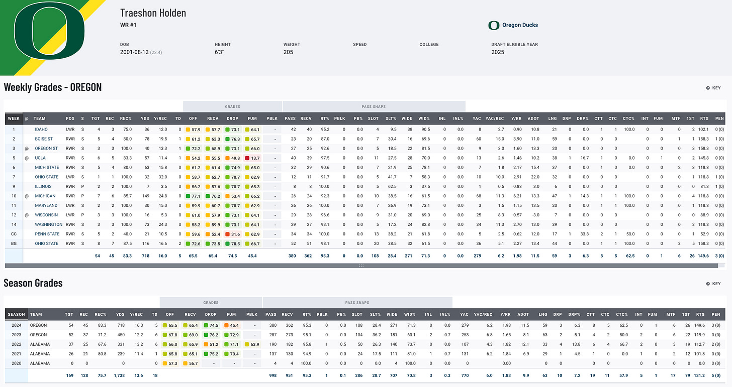 Holden saved his best for last during his final season at Oregon, showcasing his potential with 45 catches, 718 yards, and five touchdowns. His standout performances came in big moments, including a 149-yard outing against Michigan and a two-touchdown showcase in the Rose Bowl against Ohio State. Originally transferring from Alabama, Holden transitioned from a rotational role with the Crimson Tide to becoming a key contributor for Oregon, proving his value as a Z receiver. While his career at Alabama didn’t reach the same heights (46 catches over three seasons), Holden’s ability to step up in big games has him on the radar heading into the Shrine Bowl.
