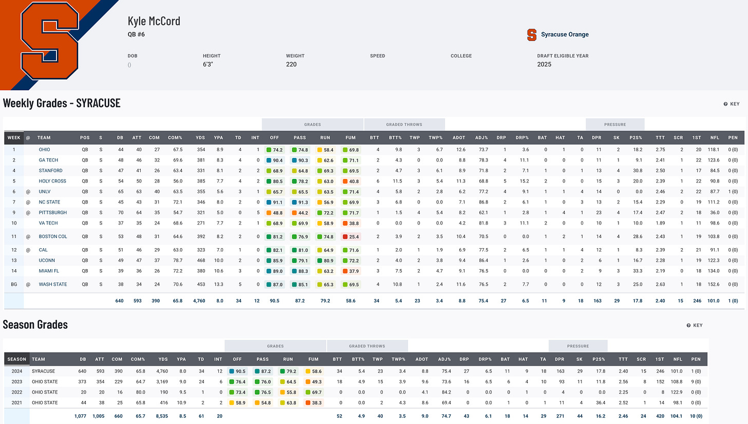 McCord’s journey through college football has been nothing short of remarkable. After transferring from Ohio State, he led Syracuse to its first 10-win season since 2018 and a Holiday Bowl victory. His 4,779 passing yards in 2024 topped the nation, breaking both ACC and Syracuse single-season records. He also set the ACC career passing record, throwing 34 touchdowns along the way. NFL evaluators are drawn to his sharp football IQ and ability to articulate offensive concepts, making his pre-draft interviews critical. Consistency during all-star games and workouts will be key as he continues to showcase his top-tier talent.