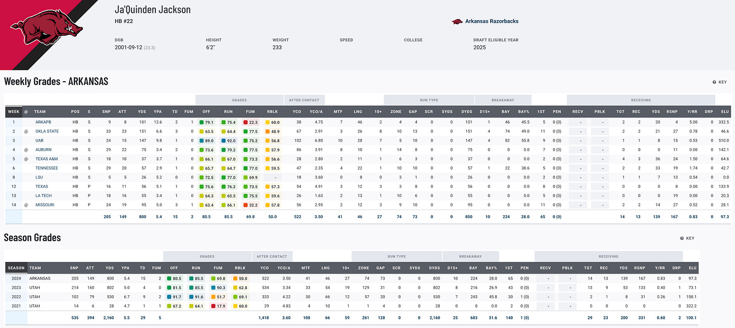 Ja’Quinden Jackson put together a strong campaign at Arkansas, racking up 790 rushing yards and 15 touchdowns in just 10 games. His standout performance came against Oklahoma State, where he ran for 149 yards and three touchdowns on 24 carries. Jackson, a former Utah transfer, has shown he can be a bruising power back who thrives in traffic, breaking tackles and weaving through defenders with ease. Injuries limited his impact at times, but his 5.3 yards per carry and PFF grades (82.7 offensive, 86.6 rushing) highlight his potential. While his decision to forego his final year of eligibility might surprise some, Jackson’s blend of size and physicality should help him carve out a role at the next level.