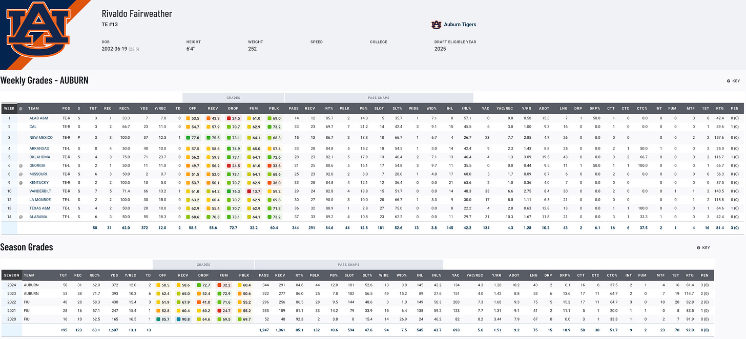 Fairweather made a name for himself after transferring from FIU to Auburn, where he quickly became the team’s top receiver in 2023, posting 38 catches for 394 yards and six touchdowns. While his 2024 stats (31 receptions, 372 yards, two touchdowns) were a slight step back, he continues to showcase his ability as a pass-catcher. With efforts from the coaching staff to develop him into a true three-down tight end, Fairweather’s improved blocking and versatility could elevate his draft stock. Fantasy managers should keep an eye on him as a sleeper candidate with long-term upside.