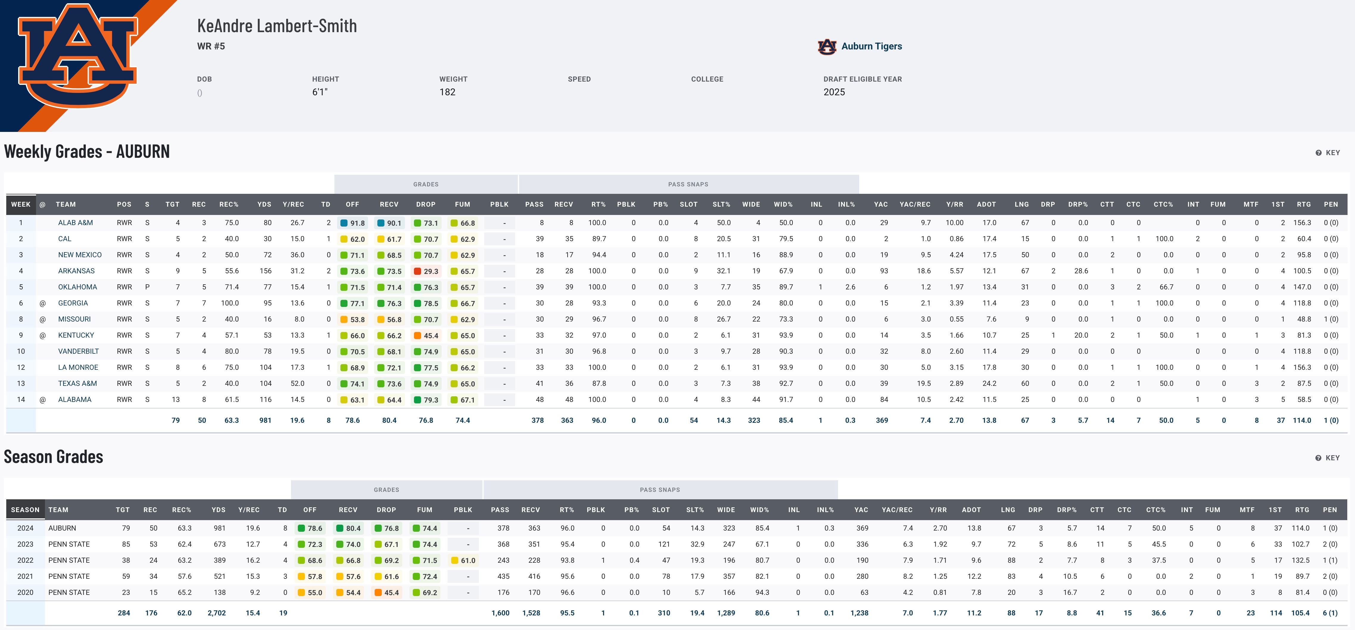 KeAndre Lambert-Smith’s journey has been marked by consistent production and steady improvement. After starting his career at Penn State, where he recorded 126 catches for 1,721 yards and 11 touchdowns, he transferred to Auburn for his final season. Lambert-Smith made an immediate impact, posting 50 receptions for 981 yards and eight touchdowns, earning second-team All-SEC honors. With 176 career catches and over 2,600 receiving yards, he brings a wealth of experience and versatility to the table. His route-running and ability to create separation make him a polished prospect with significant upside.