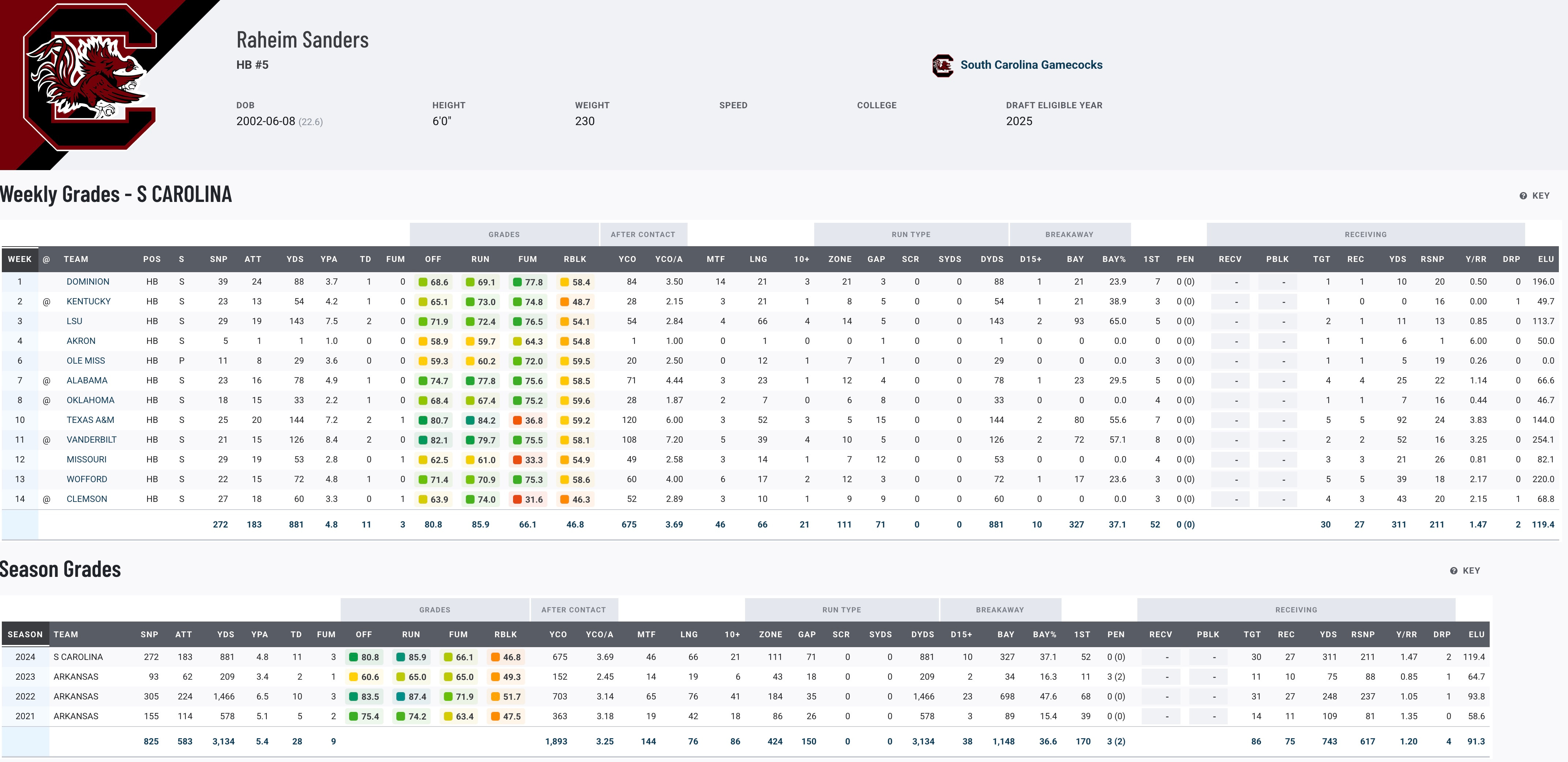 Raheim Sanders rebounded this season with 881 rushing yards and 11 touchdowns for South Carolina after transferring from Arkansas. Despite battling a knee injury early in the year, he delivered when healthy, including a 103-yard performance against Florida. Sanders’ sophomore campaign at Arkansas remains a highlight, with 1,443 rushing yards and All-SEC honors to his name. As a versatile back with receiving ability (316 yards and 2 TDs this year), Sanders combines power, speed, and versatility, making him a valuable asset for any offense. His leadership as a team captain only enhances his appeal.