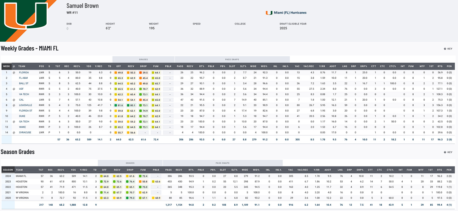 Sam Brown has had a journeyman college career, playing at West Virginia, Houston, and finally Miami, where he put up 36 catches for 509 yards and two touchdowns this past season. Over five years, he totaled 149 receptions for 1,903 yards and nine touchdowns. While his numbers don’t jump off the page, Brown’s experience and solid fundamentals make him a reliable depth option with some upside as a pro.