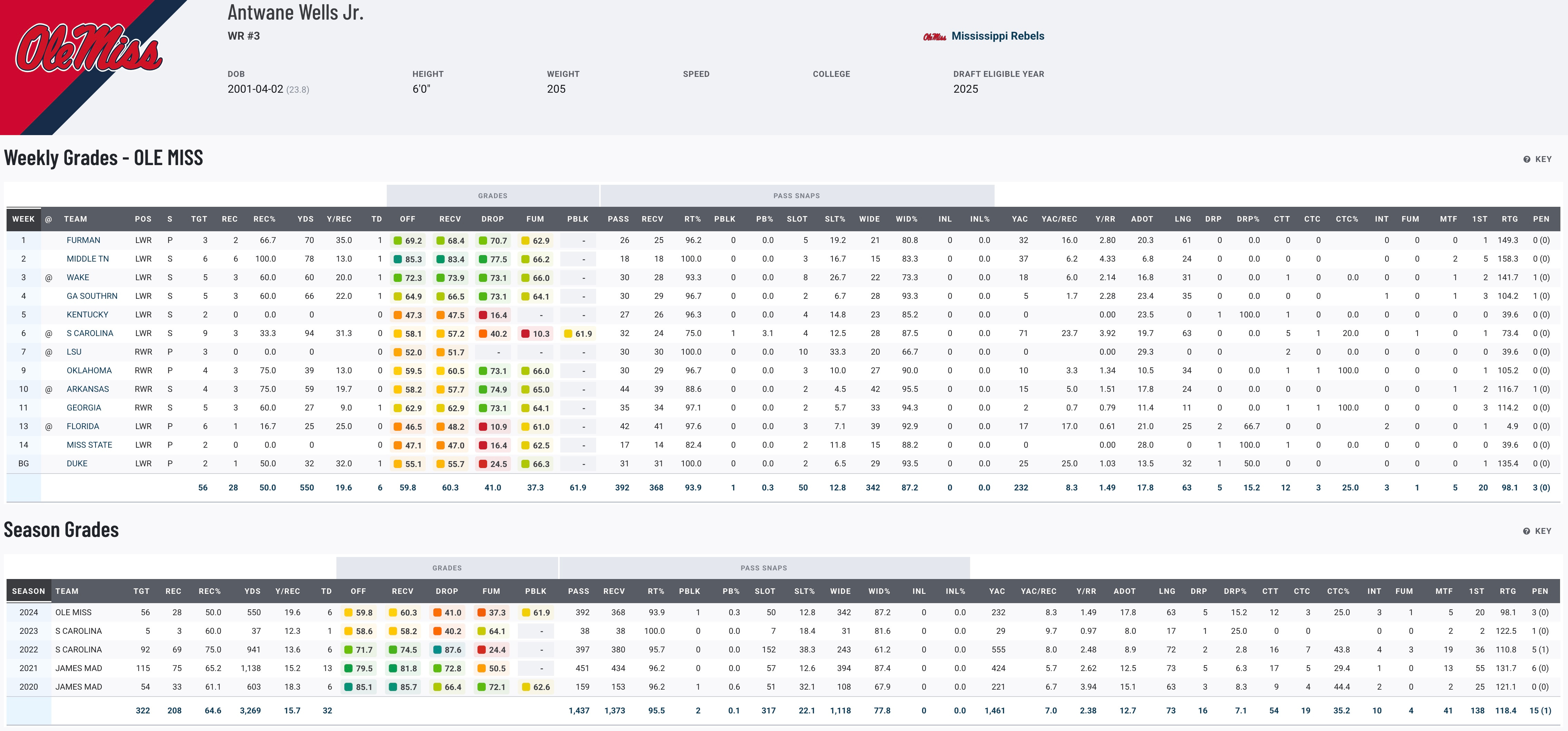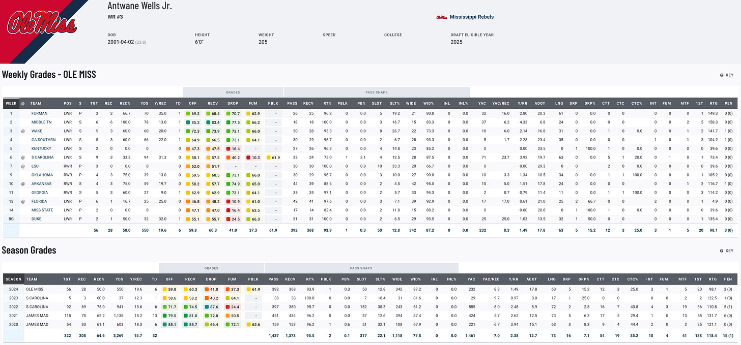 Juice Wells has had a rollercoaster college career, starting strong at James Madison before transferring to South Carolina, where he quickly became Spencer Rattler’s go-to guy. Despite putting up solid numbers in 2022, his past two seasons have been riddled with injuries, including a foot issue that limited his impact. This year, he bounced back somewhat at Ole Miss, tallying 28 catches for 553 yards and six touchdowns. Wells has undeniable talent but hasn’t lived up to expectations lately. A standout Shrine Bowl performance could be his ticket to a Combine invite and a shot at elevating his draft stock.