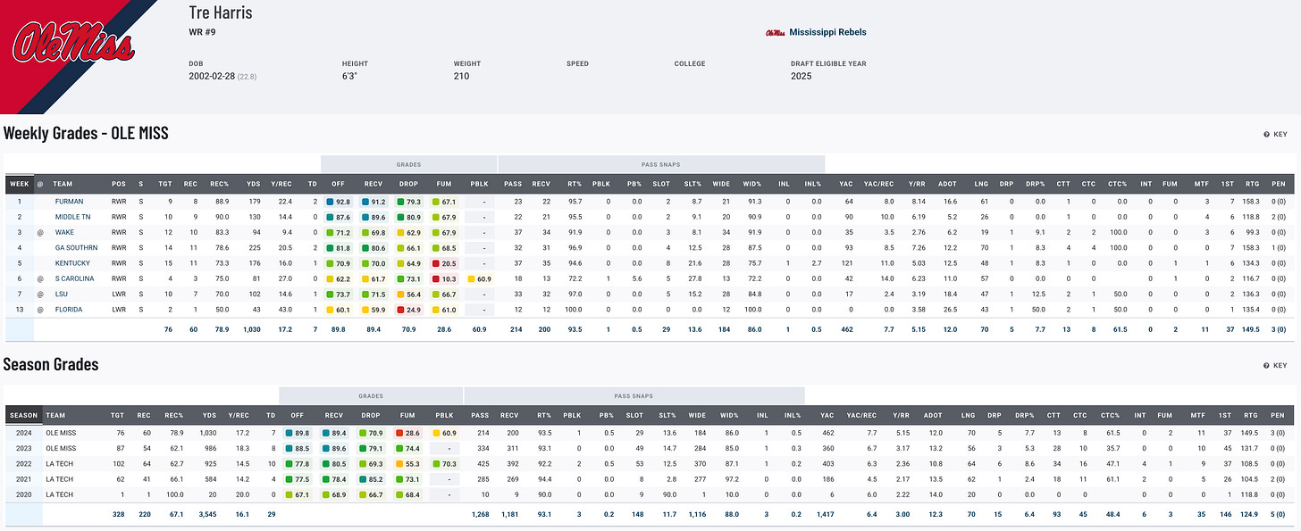 Tre Harris has first-round potential and the tools to become a starting NFL wide receiver. At 6’2” with a solid frame, Harris combines body control, physicality, and route-running ability to dominate in mismatches. He’s productive in jump-ball situations and is versatile enough to play both outside and in the slot. While his route tree remains limited due to scheme constraints at Ole Miss, Harris has demonstrated enough polish to suggest he can grow into a reliable option for any passing attack. Teams undervaluing him as a third-round prospect are overlooking a player who could quickly become a cornerstone receiver at the next level.