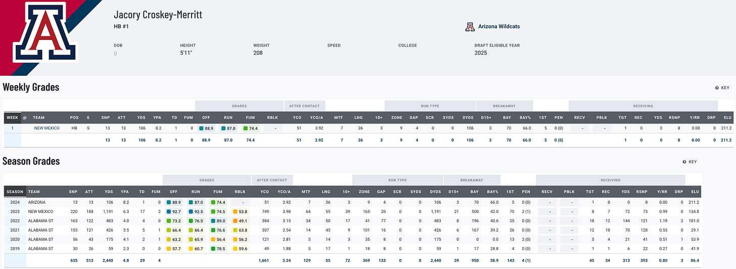 Jacory Croskey-Merritt flashed big-time potential in 2023, rushing for 1,190 yards and 17 touchdowns for New Mexico. A two-time flip between Arizona and Ole Miss added some drama to his career, but his talent speaks for itself. In limited action this season due to eligibility concerns, Croskey-Merritt showed his explosiveness with 106 yards and a touchdown in his lone game. Averaging 6.3 yards per carry in his breakout season, he has the tools to emerge as a dynamic offensive weapon if given the opportunity.