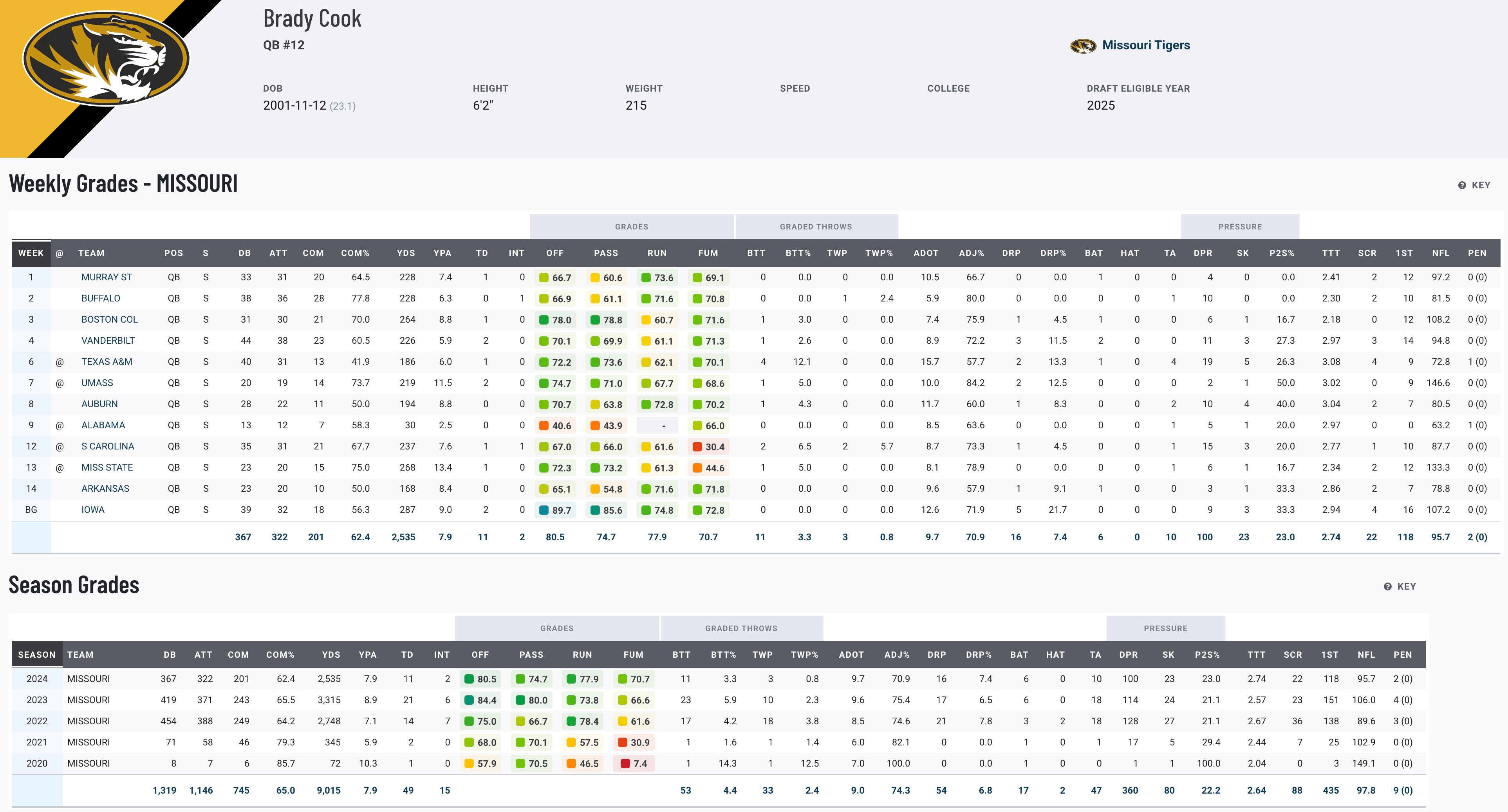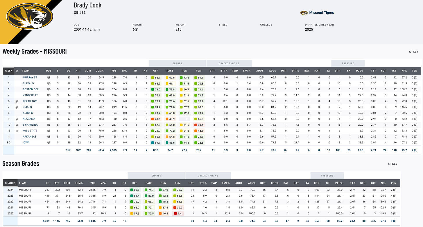 Cook’s career at Missouri solidified him as one of the program’s all-time greats. His 26-13 record as a starter ranks second in school history, and he became the first Tigers quarterback to surpass 9,000 passing and 1,000 rushing yards in a career. Cook is a dual-threat player with a knack for consistency, finishing with over 10,000 yards of total offense and ranking top-five in multiple school passing categories. His leadership and production make him a name to watch for NFL teams seeking a reliable and versatile quarterback.
