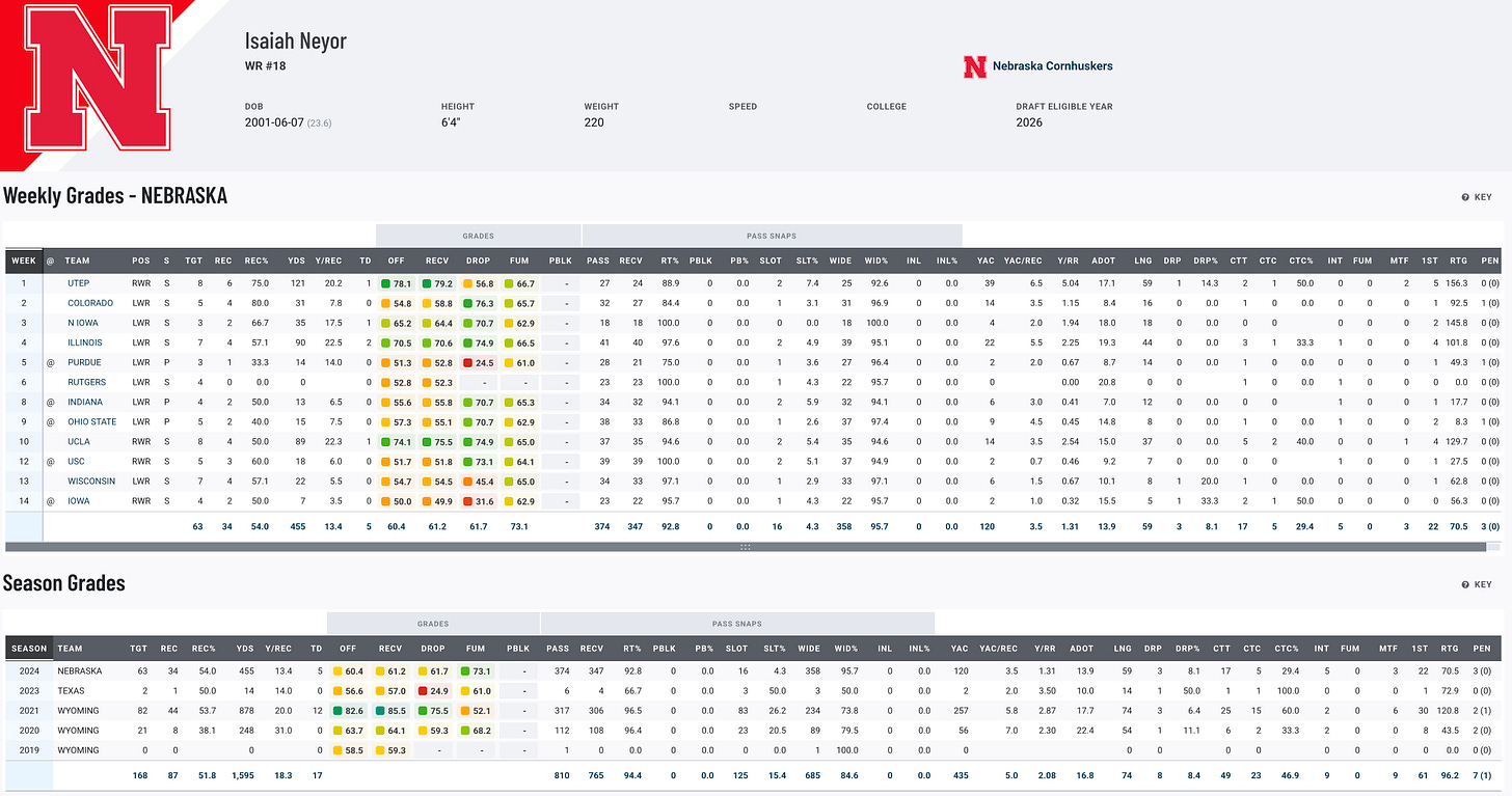 Isaiah Neyor has had a unique journey, including stints at Wyoming, Texas, and Nebraska. He’s shown flashes of brilliance, particularly in his ability to stretch the field with big plays, as seen in his 2024 performance with 34 receptions for 455 yards and five touchdowns. Standing 6’3”, Neyor excels as a vertical threat with a knack for making contested catches. Despite a rollercoaster collegiate career marked by injuries and transfers, he’s a reliable deep target with upside as a complementary receiver in the NFL.