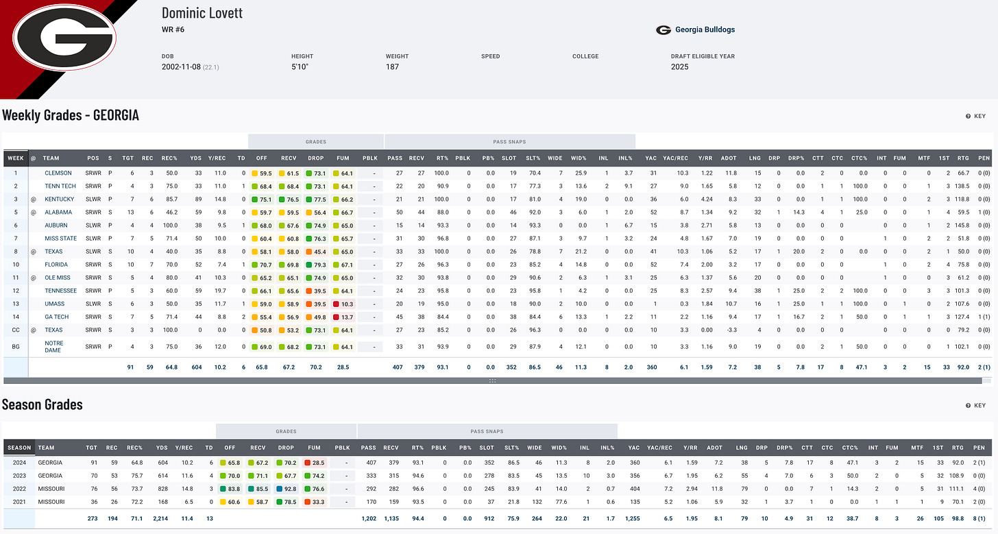 Dominic Lovett’s time at Georgia was solid, though it didn’t quite match the production of his Missouri days. In 2024, Lovett posted 59 receptions for 607 yards and six touchdowns, following up a similar campaign the year before. His 2022 season at Missouri, where he tallied 846 yards, remains his peak production, as he led the Tigers in receiving against top-tier defenses like Georgia. Georgia’s WR group struggled as a whole in 2024, leading the FBS in drops, but Lovett’s reliability and polished route-running give him a chance to impress scouts at the Shrine Bowl.