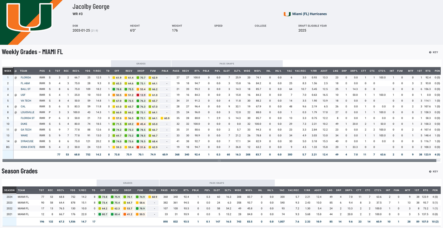 Jacolby George has been a consistent No. 2 option at Miami, putting up solid numbers with 110 receptions for 1,616 yards and 16 touchdowns over the past two seasons. His polished route-running and ability to adjust to NFL-level schemes make him a prospect to keep an eye on. George’s draft stock may hinge on his ability to separate himself during the Shrine Bowl and the pre-draft process.