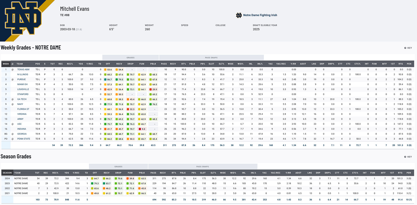 Evans has been a consistent performer for Notre Dame, using his 6’5", 253-pound frame to create mismatches in the passing game. With 39 catches for 369 yards and three touchdowns in 2024, he’s demonstrated reliable hands and football IQ, excelling in 12-personnel formations as both a blocker and receiver. While he won’t wow with elite stats, Evans offers steady production and versatility, making him a solid depth option for NFL teams and a potential fantasy contributor in deeper leagues.
