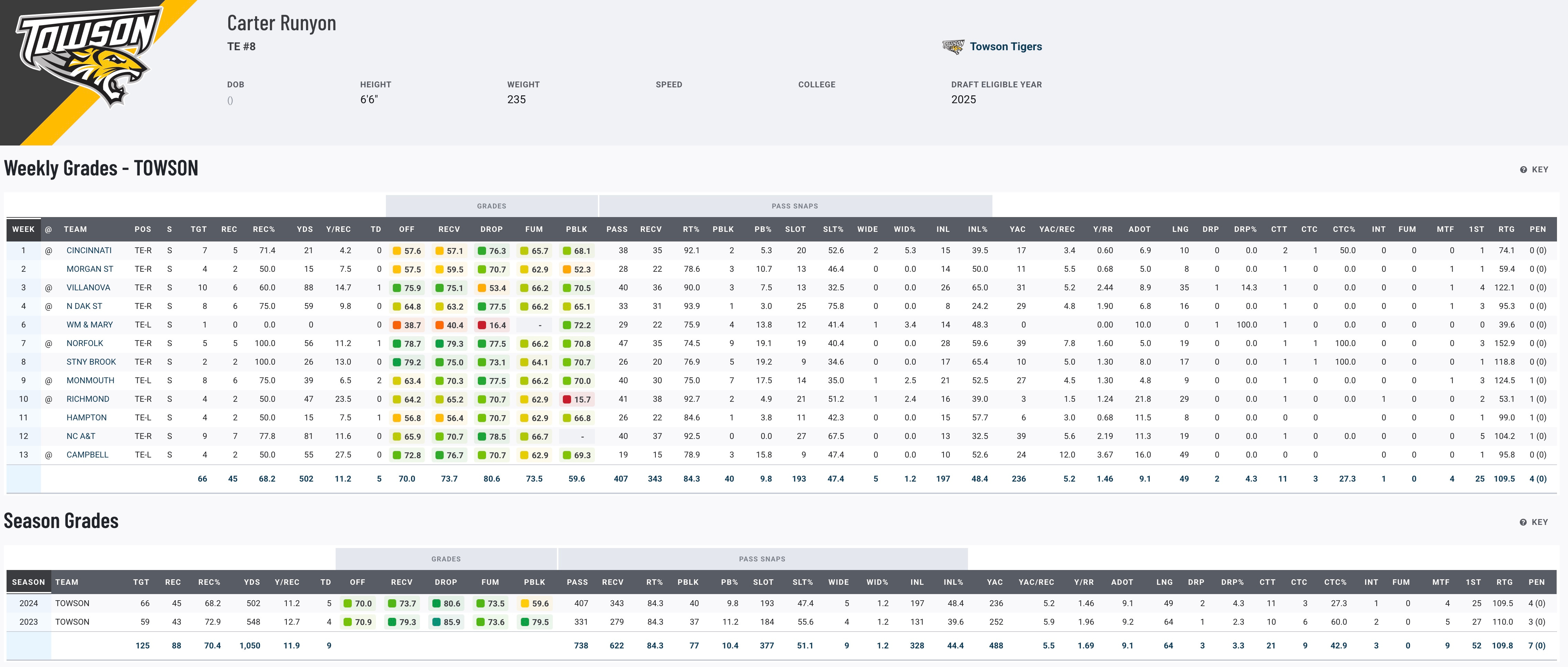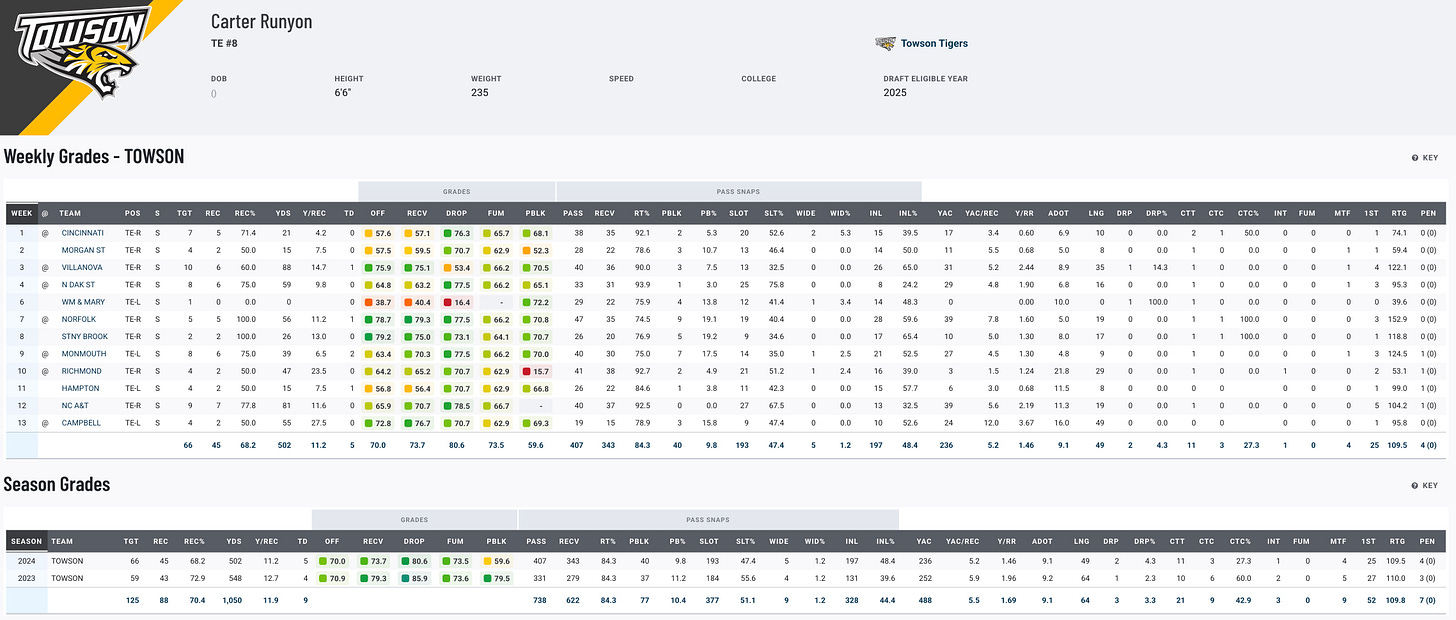 Runyon’s journey from D3 Shenandoah University to Towson has been remarkable. In 2023, he led Towson in all major receiving categories, earning All-American honors and backing it up with another strong 2024 campaign (45 catches, 502 yards, five touchdowns). His size (6’6", 235 lbs), excellent PFF grades, and small-school dominance make him a fascinating sleeper for teams looking for upside. For fantasy managers, Runyon could be this year’s small-school darling with potential as a late-round steal.