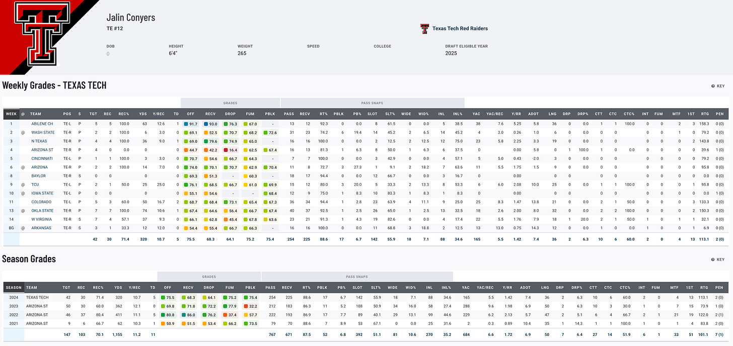 Conyers has flashed athleticism and versatility throughout his career, starting at Oklahoma before thriving at Arizona State and Texas Tech. His college numbers (104 catches for 1,166 yards and 11 touchdowns) don’t jump off the page, but his size, ball skills, and ability to contribute as a receiver and occasional runner (30 rushes for 123 yards and three scores) make him intriguing. To reach his potential as an all-around tight end, Conyers must refine his blocking and route running. Fantasy managers should view him as a developmental prospect with high upside.
