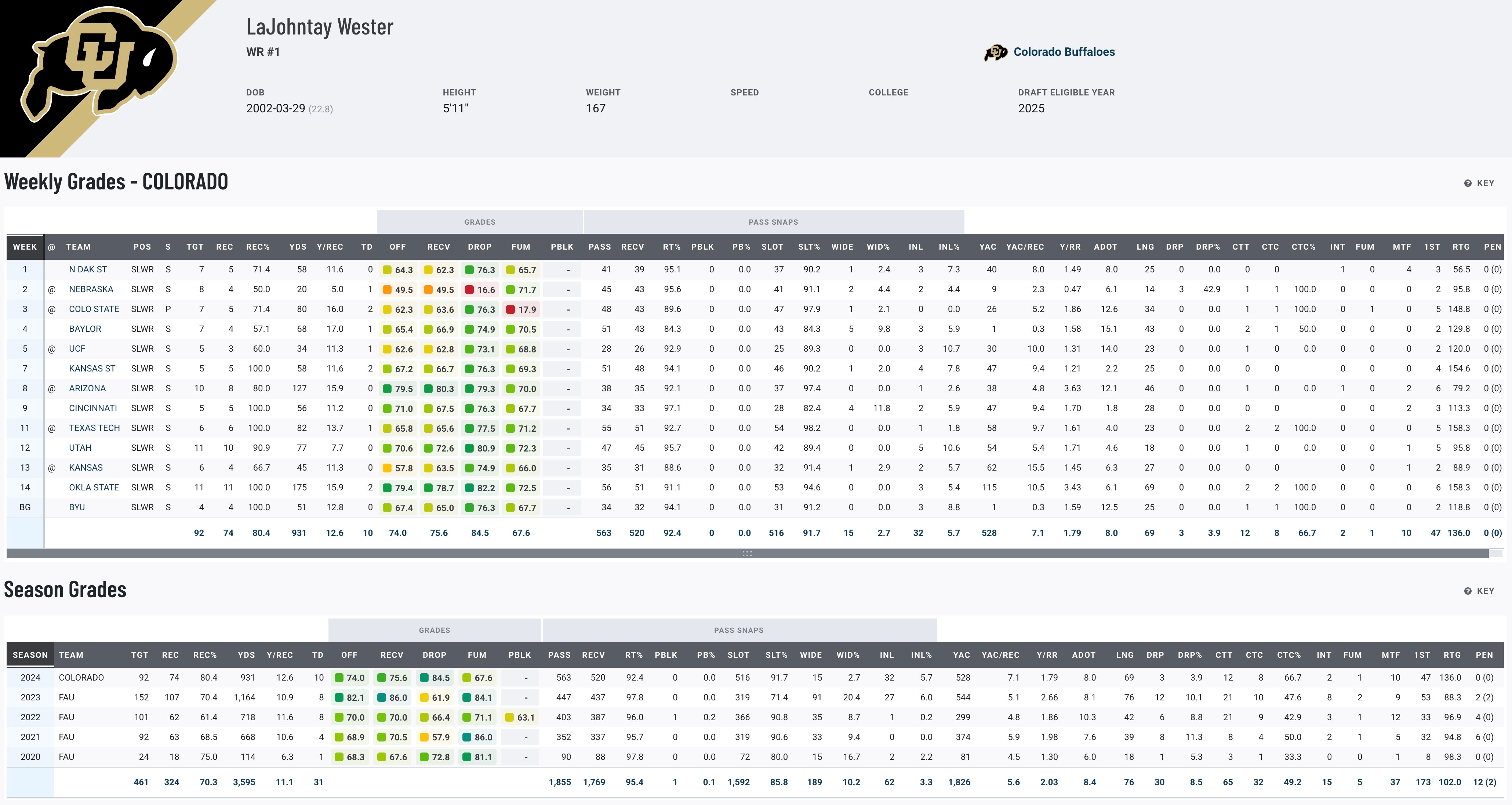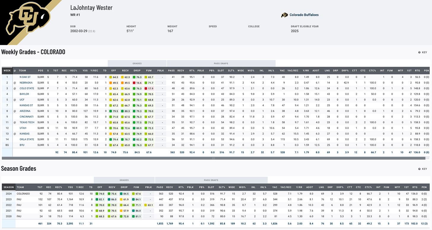 LaJohntay Wester is a versatile and electric playmaker who made a name for himself at FAU before transferring to Colorado. Over his collegiate career, Wester has demonstrated impressive production, including over 900 receiving yards and 10 touchdowns in 2024. He combines creativity, explosiveness, and a knack for finding space, making him a multi-phase asset who can impact games as a receiver and a special teams contributor. While he may not excel in contested catches, his ability to create mismatches and his versatility on special teams make him a valuable offensive chess piece for NFL teams needing playmaking options.
