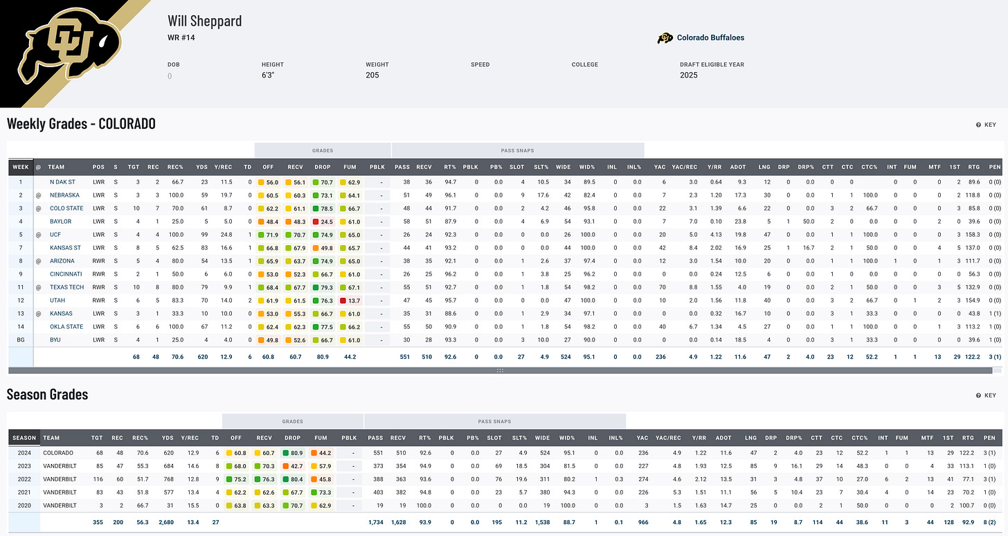 Will Sheppard has consistently shown growth throughout his college career, starting at Vanderbilt and later transferring to Colorado under Deion Sanders. Standing 6’3” and weighing 205 pounds, Sheppard thrives in contested catch situations, showcasing reliable hands and physicality that make him a threat in one-on-one matchups. His production has remained steady across different systems, including 48 catches for 620 yards and six touchdowns at Colorado. While he lacks elite separation ability, his frame and ball skills could make him a late-round steal in the NFL Draft, offering depth and potential as a possession receiver.