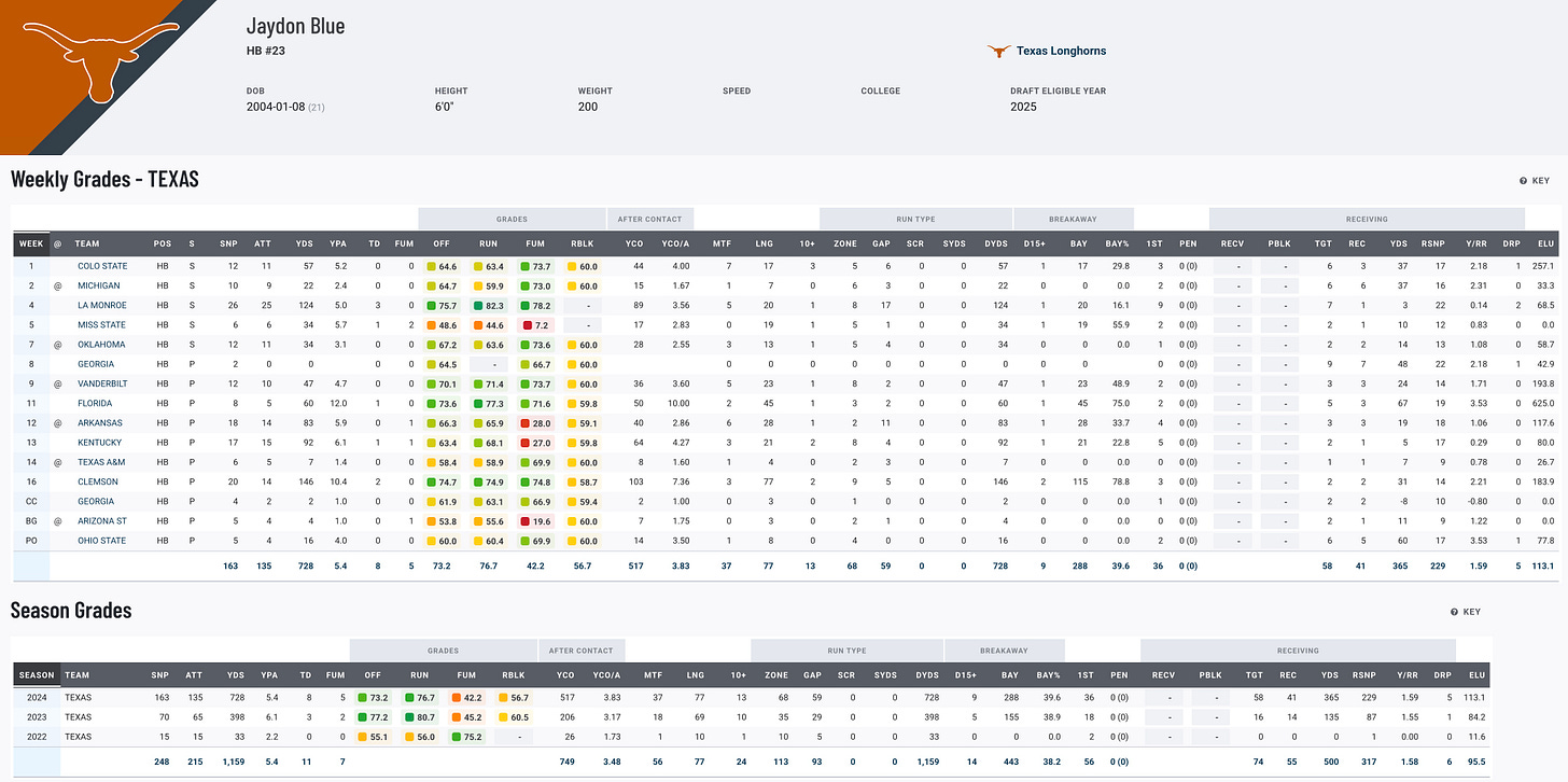 Jaydon Blue’s decision to declare for the draft wasn’t shocking, even though he had eligibility left and wasn’t the primary rusher in Texas’ backfield. Despite splitting carries, Blue was a touchdown machine, leading the team with 14 total scores (8 rushing, 6 receiving). When given opportunities, he delivered, averaging over 83 rushing yards per game in contests where he saw double-digit carries. His versatility shines as a dual-threat weapon, with 42 receptions for 368 yards and six touchdowns through the air to complement his 730 rushing yards. While his production dipped due to Quintrevion Wisner’s emergence and some ball security issues, Blue’s combination of size, speed, and playmaking ability makes him an intriguing prospect.