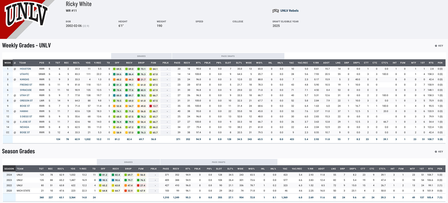 Ricky White has quietly put together an outstanding college career after transferring from Michigan State to UNLV. Over three seasons with the Rebels, he amassed 3,143 yards and 23 touchdowns on 228 catches, earning back-to-back first-team All-Mountain West honors. White also stood out on special teams, earning the conference’s Special Teams Player of the Year award. His production and versatility, particularly as a punt coverage ace, give him a strong case to make an NFL roster.