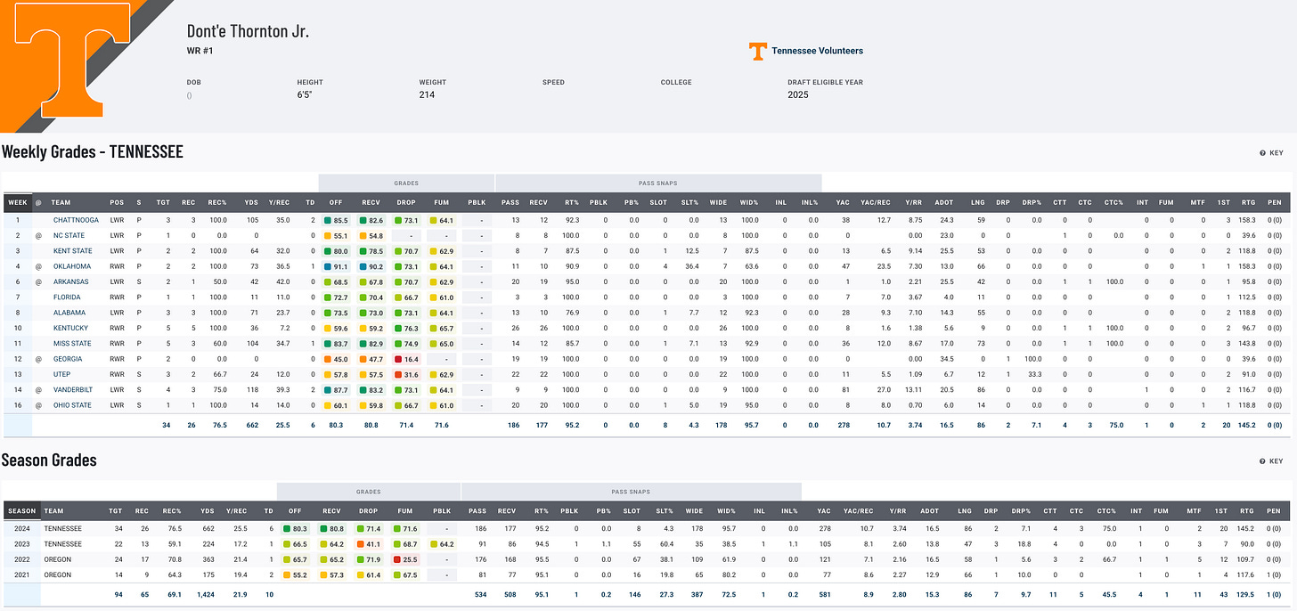 Dont’e Thornton’s career has been a mix of untapped potential and flashes of brilliance. The former Oregon standout transferred to Tennessee, where he showcased his big-play ability, leading the nation with 25.4 yards per reception. Over his college career, Thornton totaled 65 catches for 1,426 yards and 10 touchdowns. With elite speed and a track background, Thornton has the tools to be a deep threat in the NFL. However, his development and consistency will be key to unlocking his full potential.