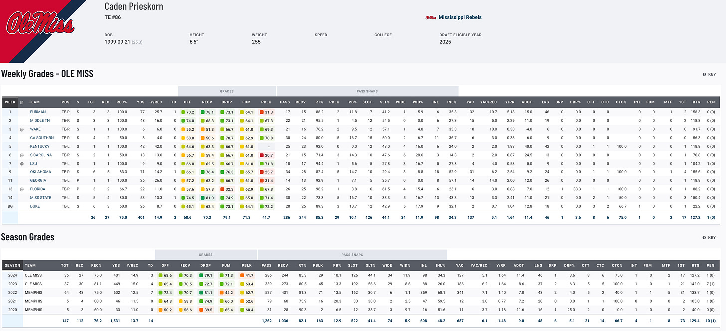 Prieskorn burst onto the scene at Memphis in 2022, earning Mackey Award semifinalist honors. His transfer to Ole Miss brought fewer statistical highs, but his tape shows a tight end who has refined his blocking and can work as a reliable intermediate target. While not the most agile, Prieskorn’s ability to improve year over year and contribute in both the passing and run games makes him a late-round draft prospect.