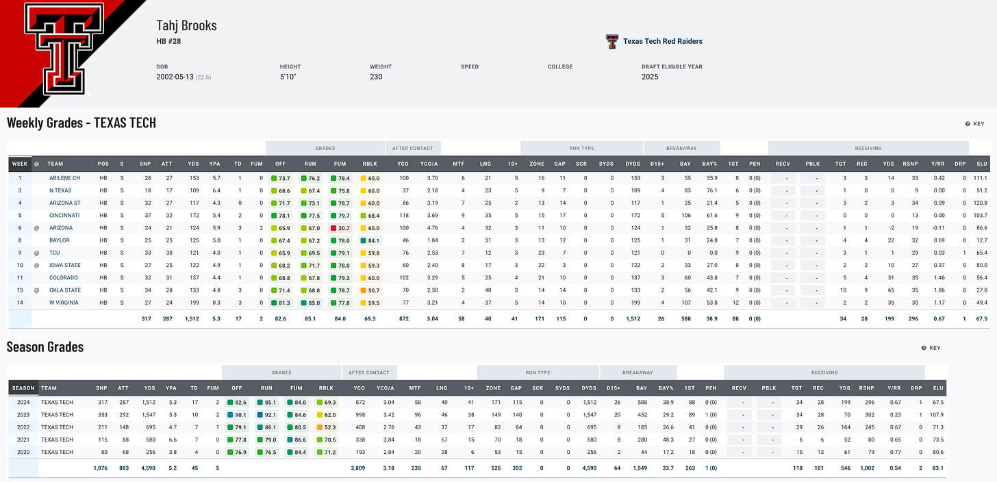 Tahj Brooks rewrote the Texas Tech record books, finishing his career with 4,557 rushing yards to become the school’s all-time leader. Known for his durability and ability to handle heavy workloads, Brooks showcased his workhorse potential with multiple games of 25+ carries in consecutive seasons. His compact frame and excellent contact balance make him a nightmare for defenders, consistently churning out extra yards after contact. Brooks’ ability to sustain production despite an increased workload should make him a highly appealing prospect for teams looking for a reliable and physical ball-carrier.
