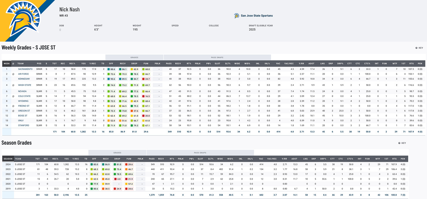 Nick Nash has been nothing short of spectacular, becoming just the fourth player in FBS history to achieve the receiving Triple Crown. His 104 receptions, 1,382 yards, and 16 touchdowns this season set multiple school records at San Jose State. Despite transitioning to receiver only two years ago, Nash’s ability to consistently produce—highlighted by leading the nation in receptions per game and yards per game—makes him a standout prospect. While his age may be a concern, his hands and football IQ could make him a hidden gem in the draft.