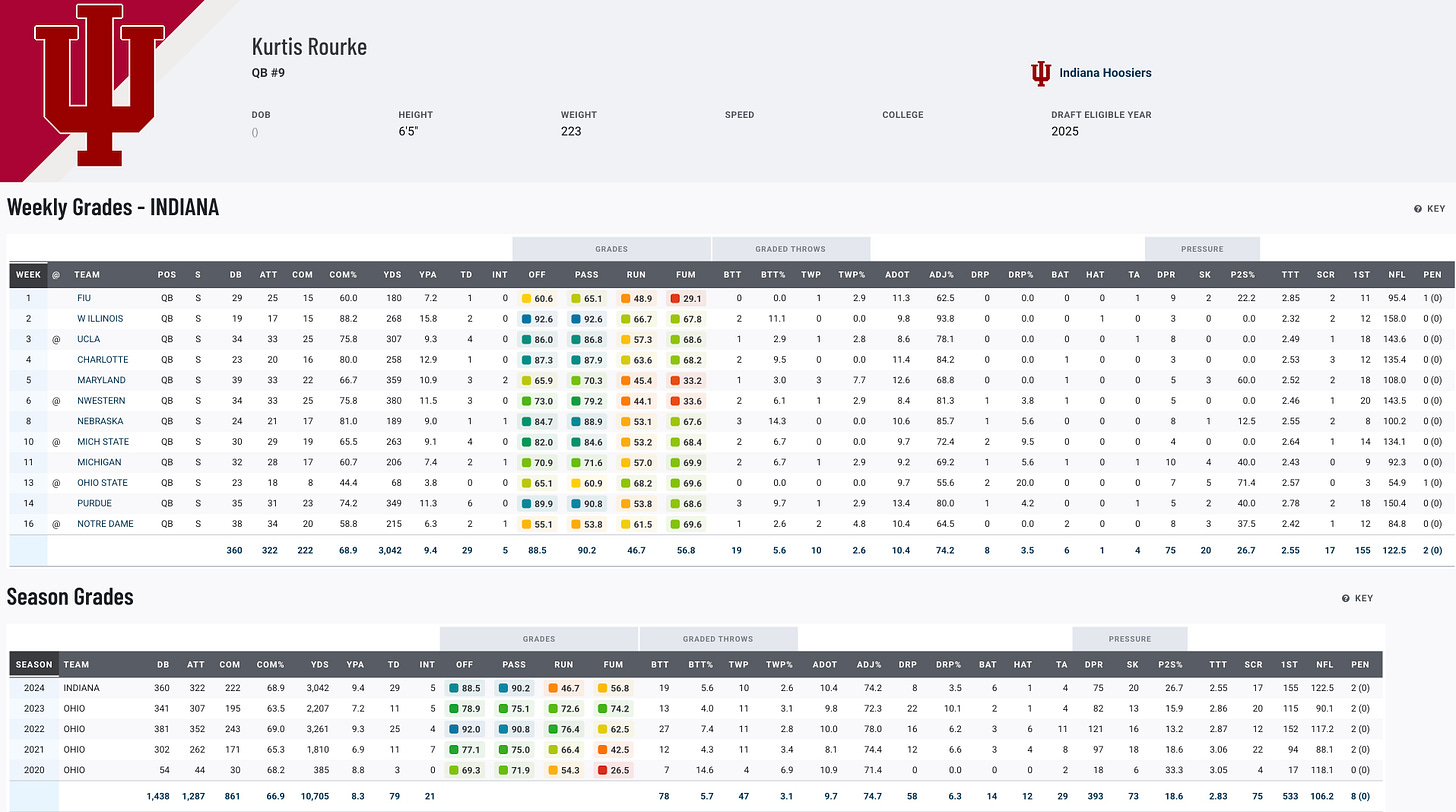 Rourke’s resilience defines his 2024 season, playing through a re-torn ACL and still delivering one of the best campaigns in Indiana history. He set a school record with 29 passing touchdowns, threw for 3,042 yards, and led the Hoosiers to the College Football Playoff. A Maxwell and Walter Camp Award semifinalist, Rourke is known for his efficiency, with only five interceptions on the season. While injuries may limit his mobility in pre-draft evaluations, his arm strength and accuracy should keep him in the conversation as a viable NFL prospect.