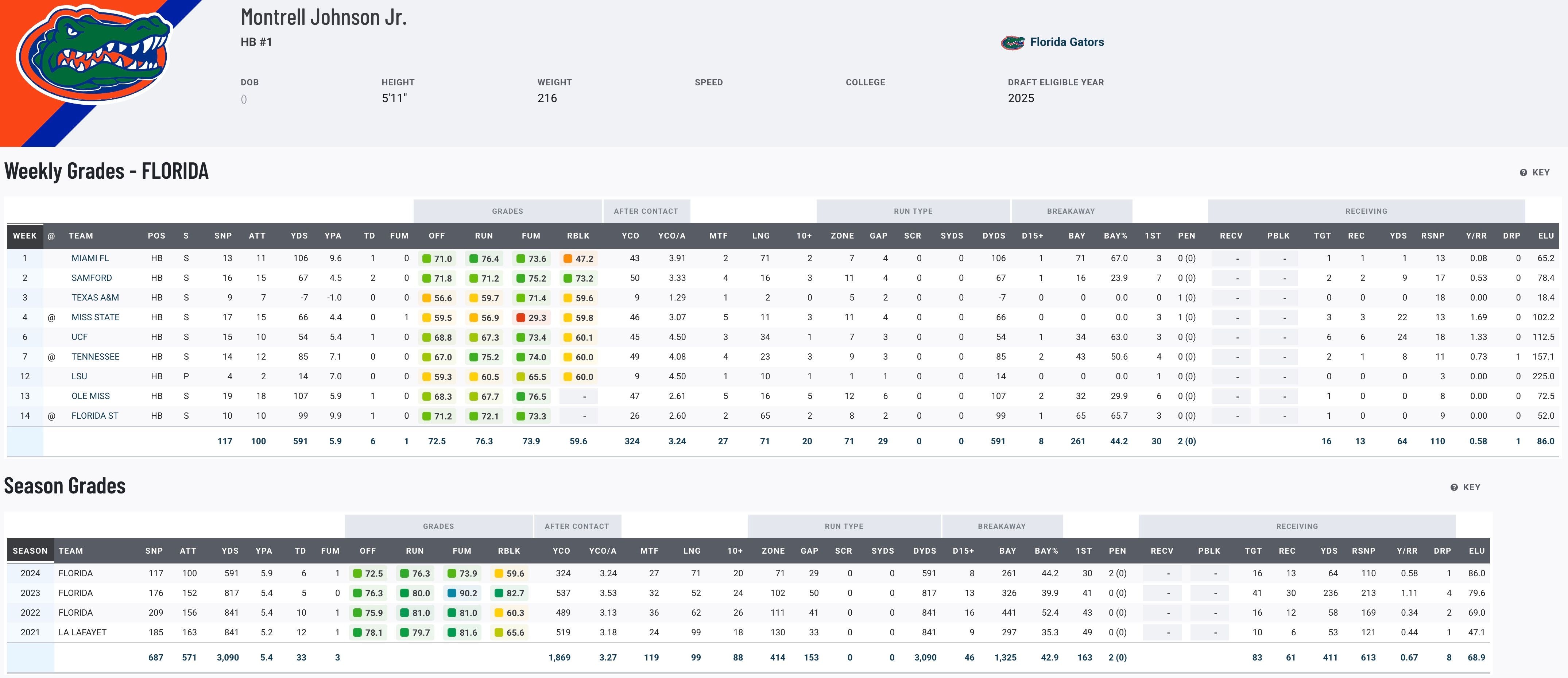 Montrell Johnson’s career has been defined by his knack for rising to the occasion. Starting at Louisiana with Billy Napier, Johnson burst onto the scene with 12 touchdowns as a freshman before following Napier to Florida. Over three years with the Gators, Johnson became a steady force, surpassing 3,000 career rushing yards and demonstrating an ability to perform in big moments. Injuries limited his senior campaign, but he still managed 593 yards and six touchdowns on 100 carries. A milestone-driven player, Johnson’s consistency and big-play ability—highlighted by his 99-yard touchdown as a freshman—make him a solid mid-round prospect with upside as a dependable backfield option.