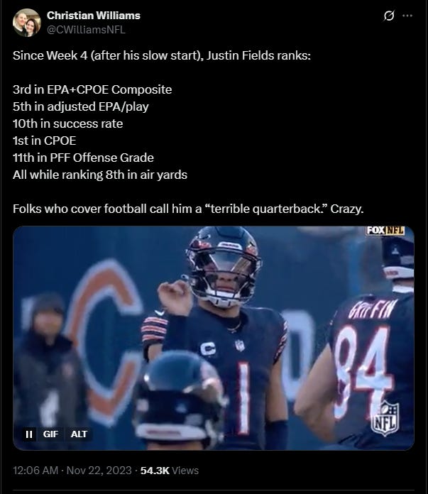 Of course, much of this would have been forgotten had Fields played with any semblance of consistency throughout his rookie deal. Stretches of play consistent with top-ten starters in the league were interrupted by injuries and atrocious performances. His elite play extension and rushing ability were often on display. His slow footwork and inconsistent field vision were just as prevalent.