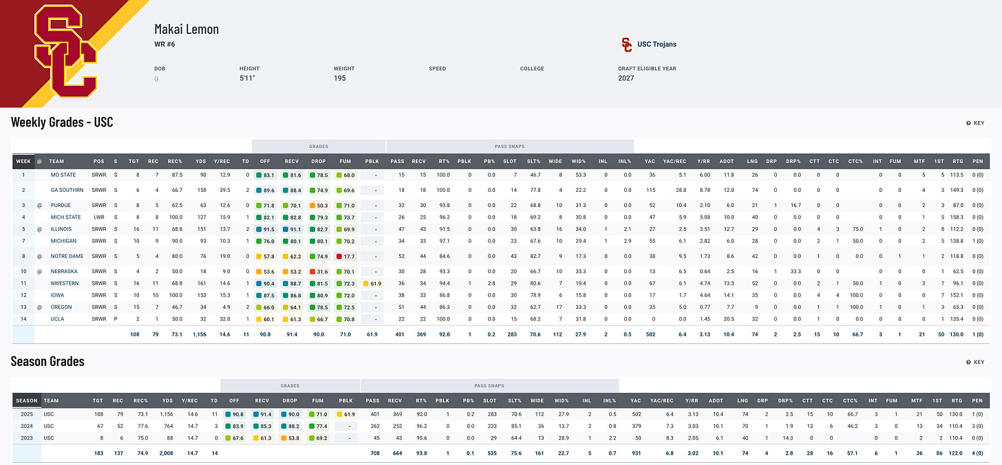 Makai Lemon is one of the most dynamic weapons in college football, bringing positional versatility, separation ability, and playmaking juice to the USC offense. His usage and role flexibility make him especially intriguing when projecting to the next level.