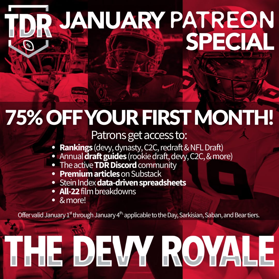 Throughout the offseason, we’ll continue to deliver written breakdowns, video deep dives, and podcast analysis centered on the next wave of NFL talent. On Patreon, members get access to one of the most immersive ranking systems in the space, including Dynasty, Devy, C2C, and Combined Rankings, all tied together with a trade calculator built on those same values.
