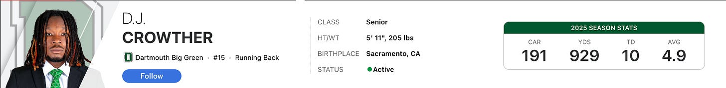 Crowther is just a tough runner. That’s the best way I can put it. At Dartmouth, he put up nearly 1,000 yards in 10 games, and when you watch film, he just runs hard and seeks contact. Now he’s at USF, he’s competing for RB1 with Alvon Isaac. He actually complements him well as a more powerful back to Isaac, who is the speedier guy. Whoever starts, he has the best opportunity to get on the field early and often, which is what I want with these RBs.